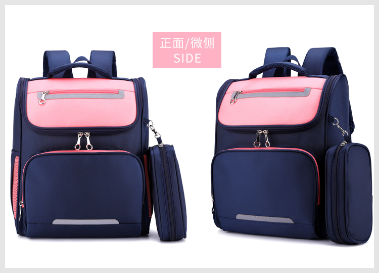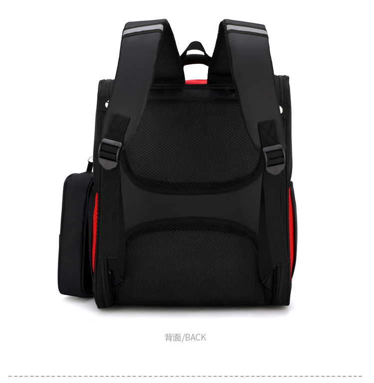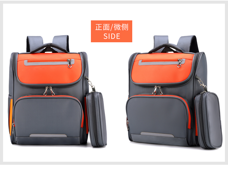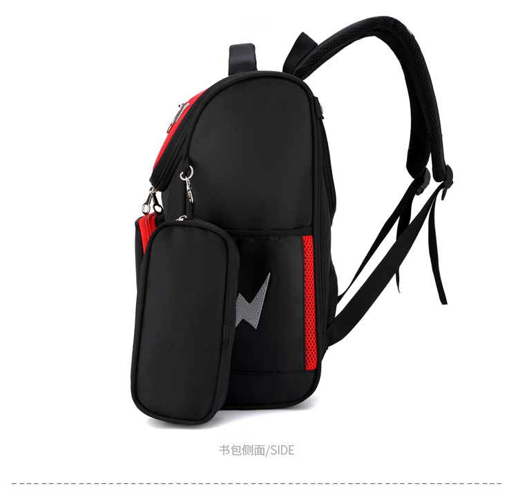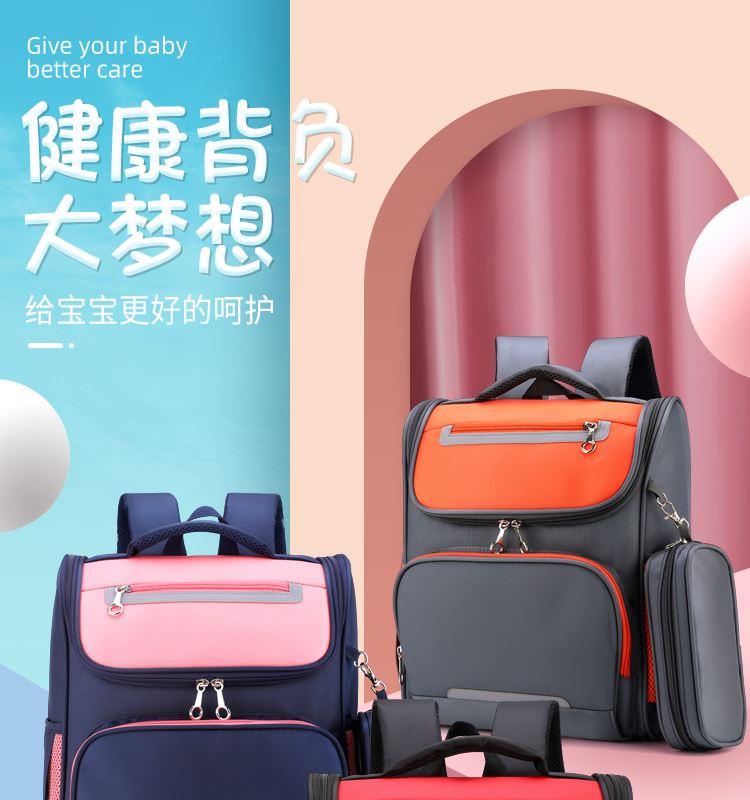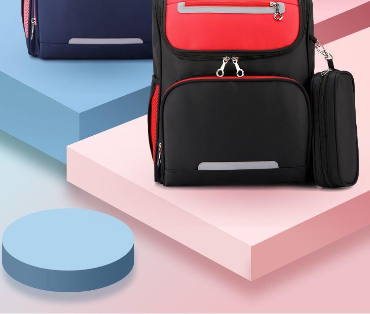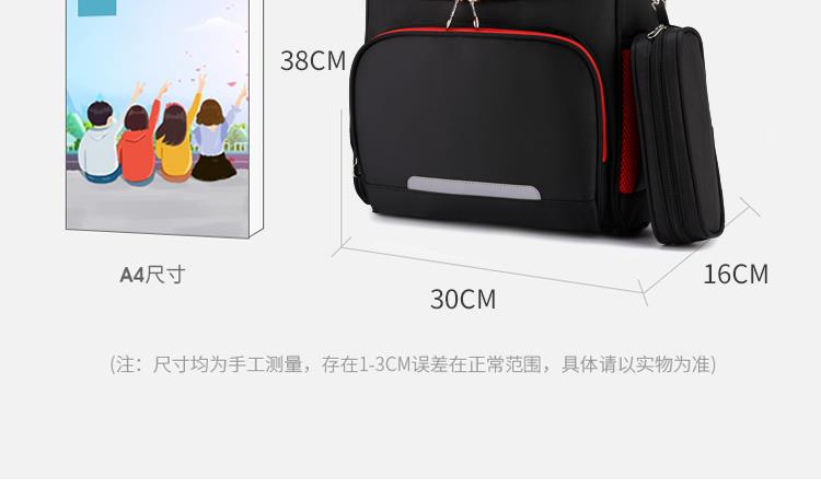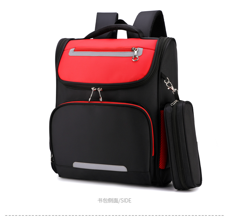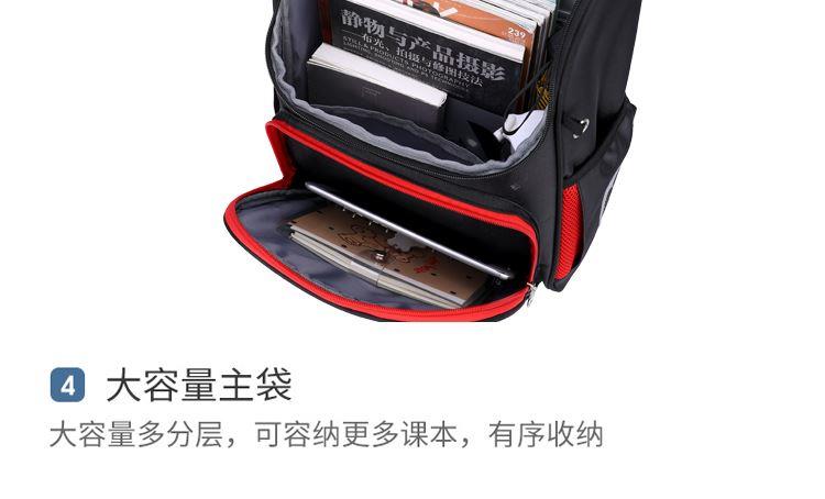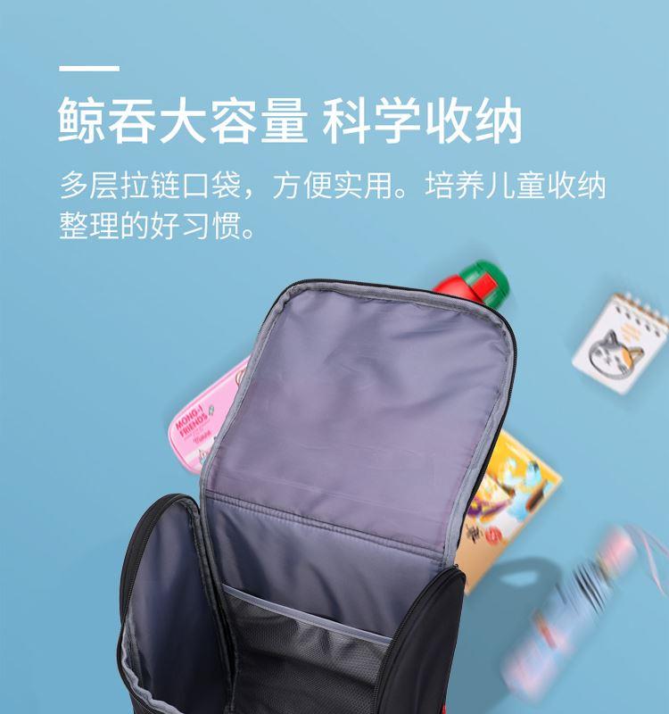 产品参数: 型号:儿童书包3202 颜色:黄蓝、粉蓝、黑红、橙灰 尺寸:30*16*38cm 材质:高密度尼龙面料 内部:有隔层 重量:0.45kg 商品简介: 防泼水面料,轻盈材质,人体工学设计,减负护脊。轻松上学,不要负担。书包肩带与侧面添加安全反光条的设计,让宝宝的出行更加安全。