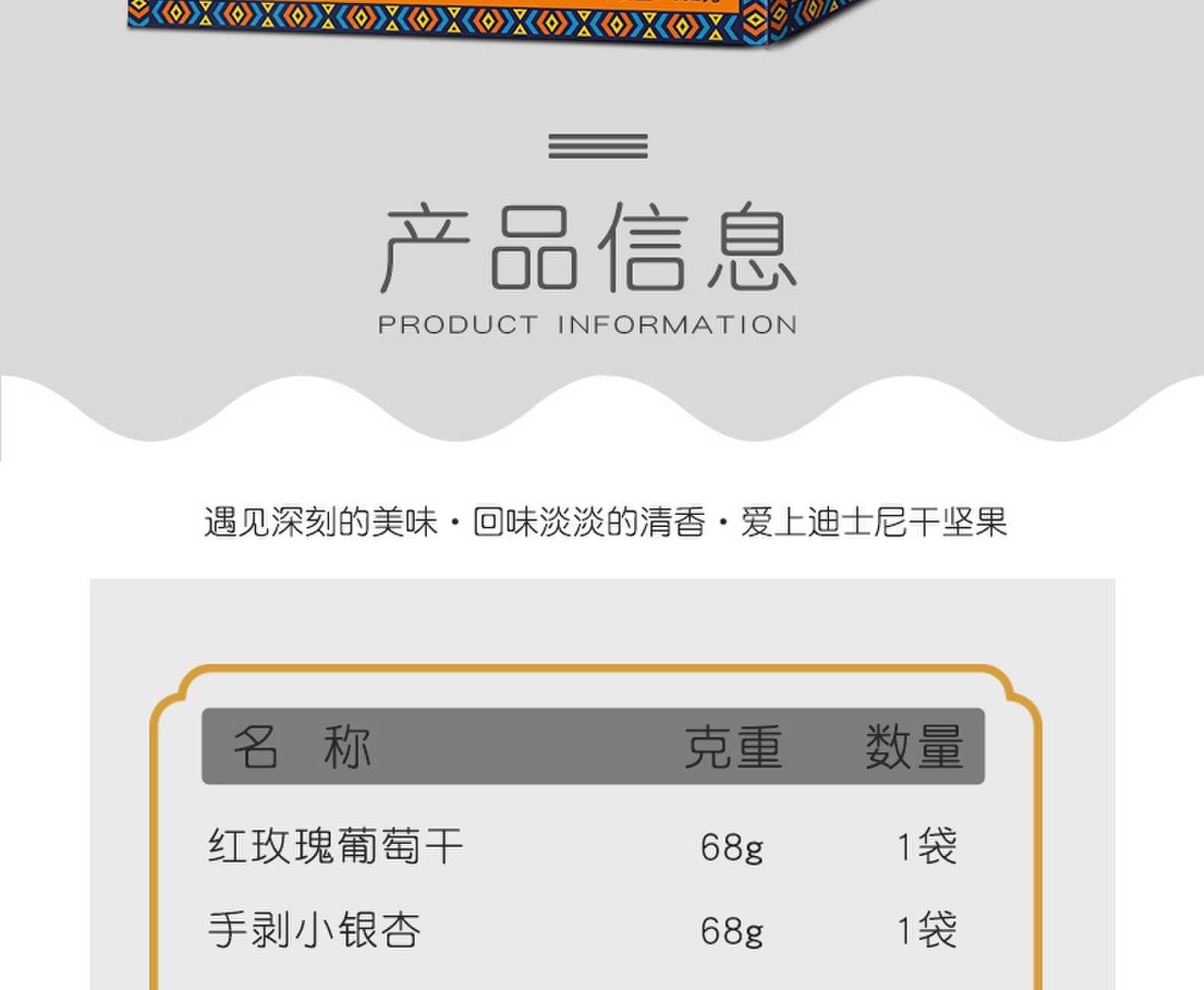 迪士尼红玫瑰葡萄干68g 迪士尼手剥小银杏68g 迪士尼绿宝石葡萄干68g 迪士尼鱼皮花生68g 迪士尼经典每日坚果25g 迪士尼经典每日坚果25g 迪士尼芒果干38g 迪士尼蔓越莓干38g 迪士尼巴达木38g 迪士尼腰果38g 迪士尼草原蘑菇头120g 迪士尼薄皮核桃258g