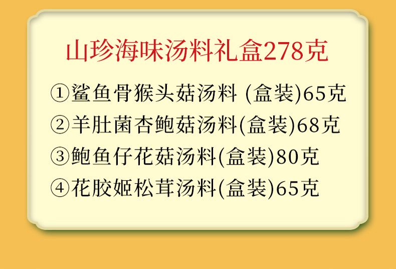 鲨鱼骨猴头菇汤料 (盒装)65克 羊肚菌杏鲍菇汤料(盒装)68克 花胶姬松茸汤料(盒装)65克 鲍鱼仔花菇汤料(盒装) 80克