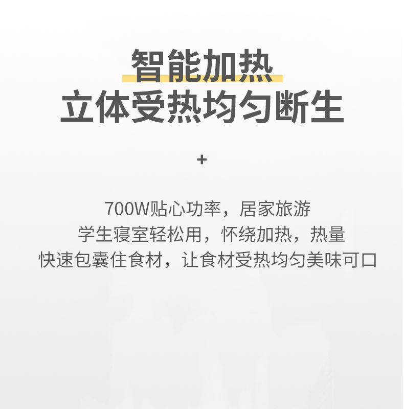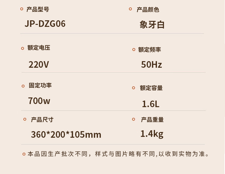 产品型号:JP-DZG06 产品颜色:白色 额定功率:700W 额定容量:1.6L 额定电压:220V~ 额定频率:50Hz 产品毛重:1.4KG 产品尺寸:360*200*105MM 包装尺寸:386*245*150MM 装箱数量:单台为网盒包装箱;1台/箱