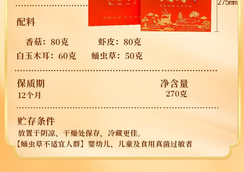 香菇80g,白玉木耳60g,虾皮80g,蛹虫草50g
