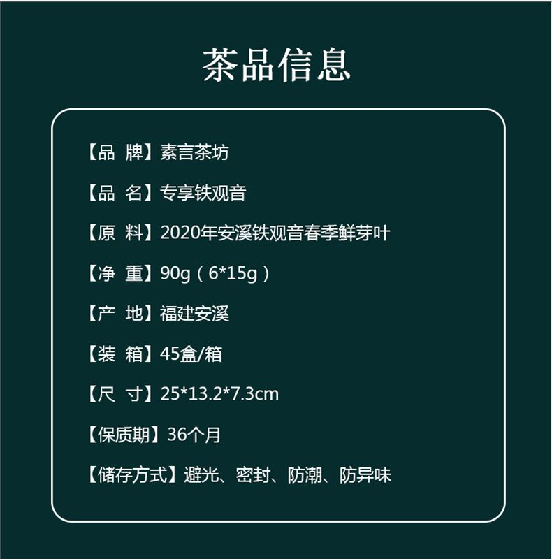产品品名:专享铁观音 产品信息:2020年安溪铁观音90克 规格:25*13.2*7.3cm 产地:福建安溪县