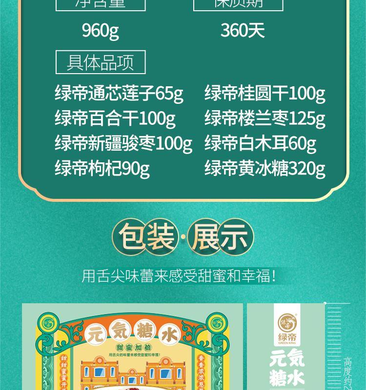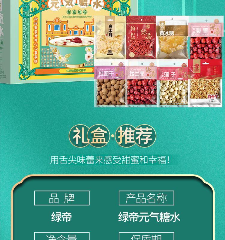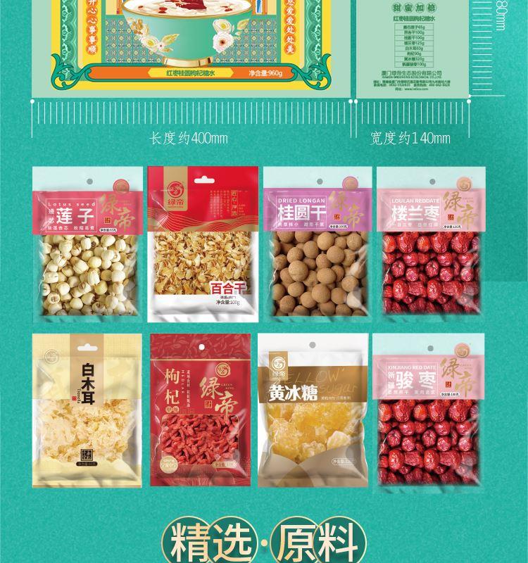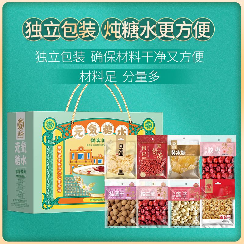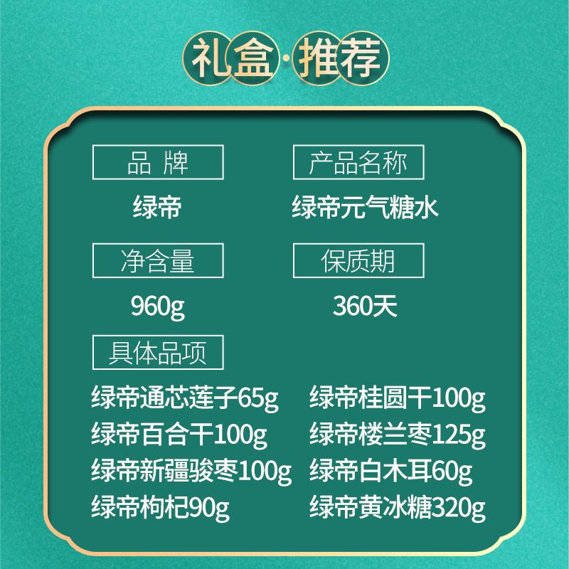 产品组合: 绿帝白木耳60g 绿帝甲级枸杞90g 绿帝黄冰糖320g 绿帝百合干100g 绿帝通芯莲子65g 绿帝桂圆干100g 绿帝楼兰枣125g 绿帝新疆骏枣100g 礼盒 礼盒尺寸:40.5*13*28cm