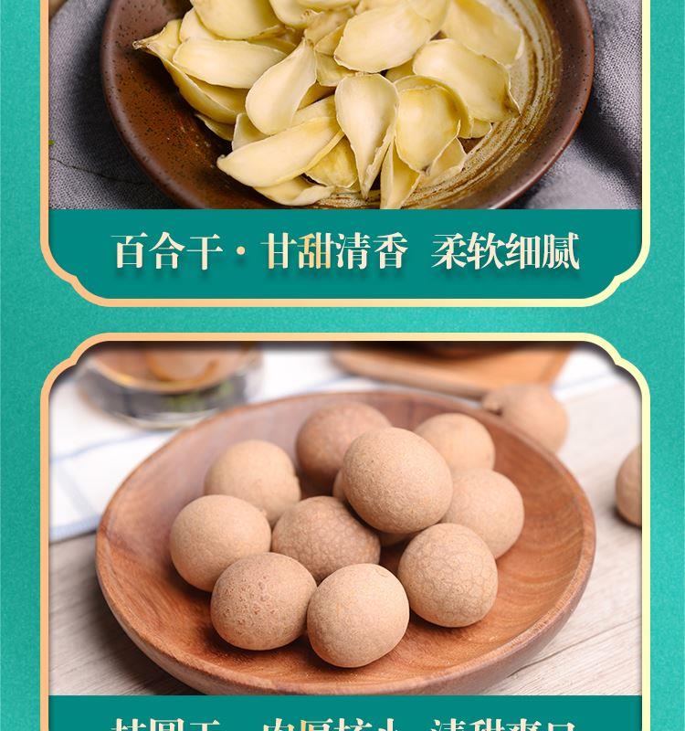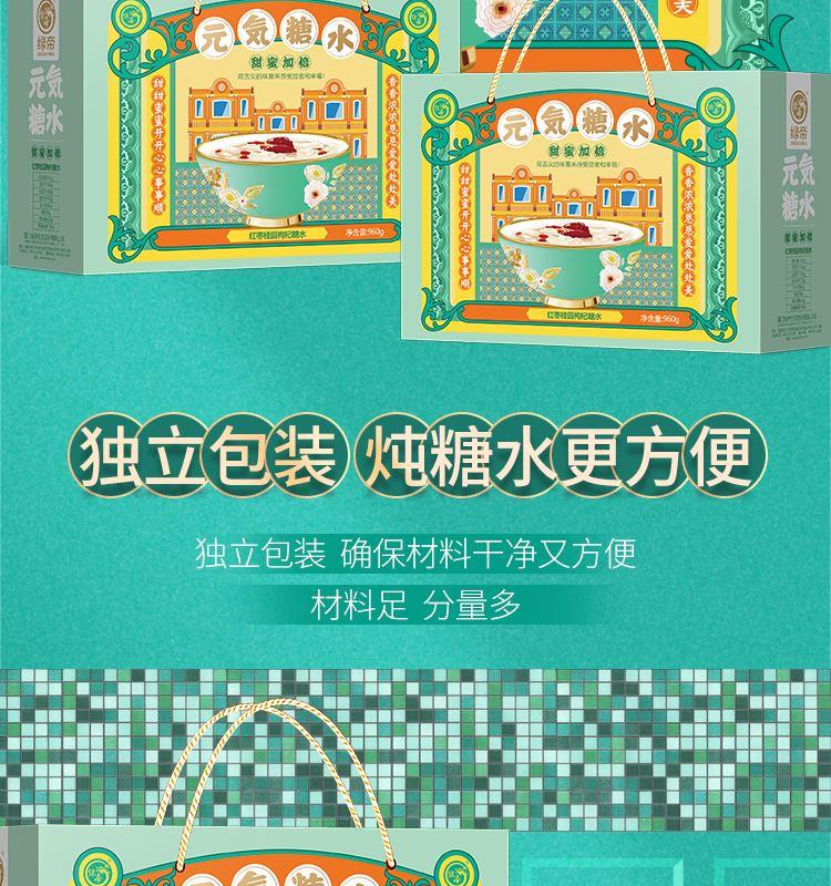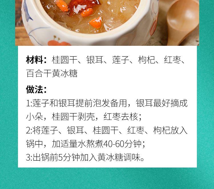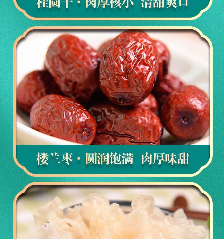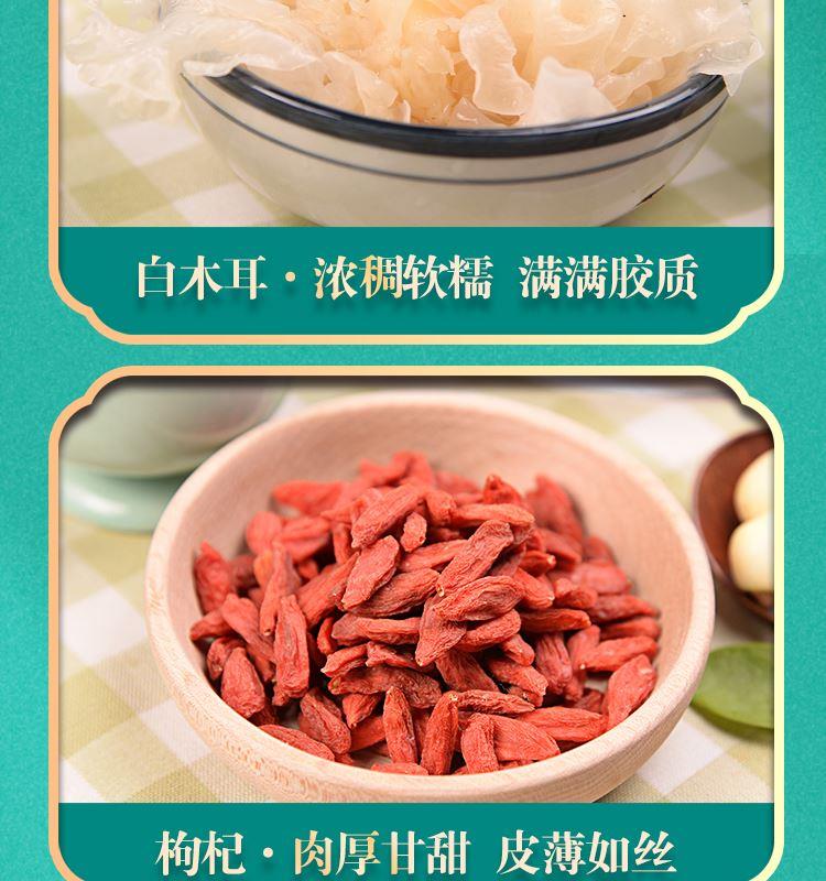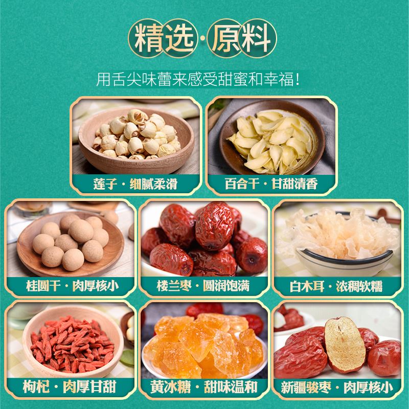 产品组合: 绿帝白木耳60g 绿帝甲级枸杞90g 绿帝黄冰糖320g 绿帝百合干100g 绿帝通芯莲子65g 绿帝桂圆干100g 绿帝楼兰枣125g 绿帝新疆骏枣100g 礼盒 礼盒尺寸:40.5*13*28cm