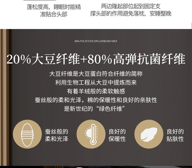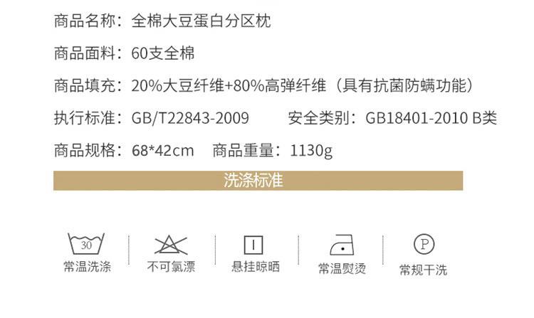 商品名称:啄木鸟科技大豆蛋白分区枕-汉姆 商品货号:ZZX-0003 商品型号:尺寸:68x42cm重量:1130g 商品材质:面料:全棉填充:20%大豆纤维+80%聚酯纤维