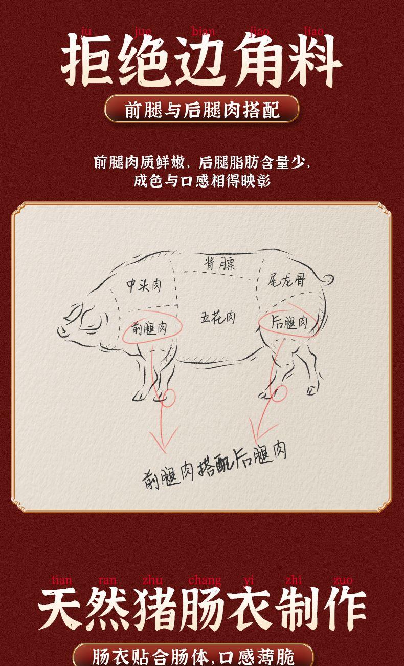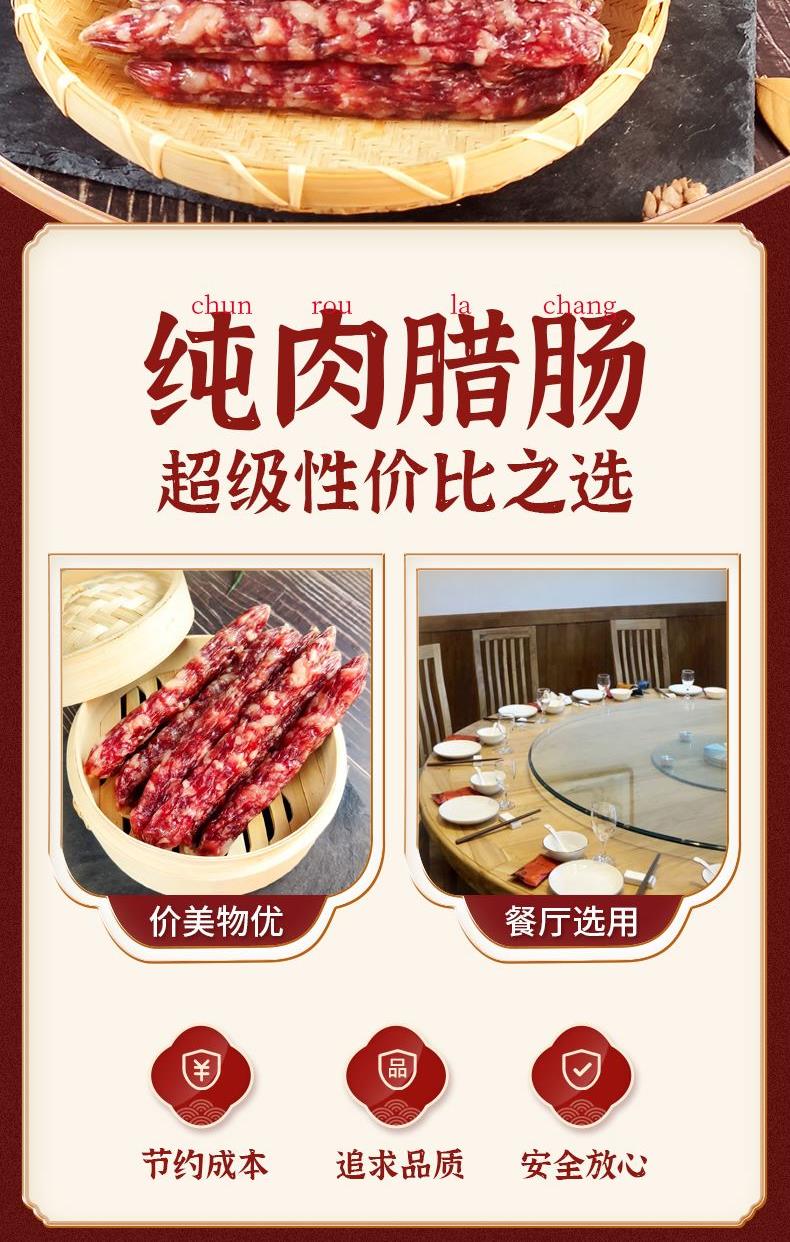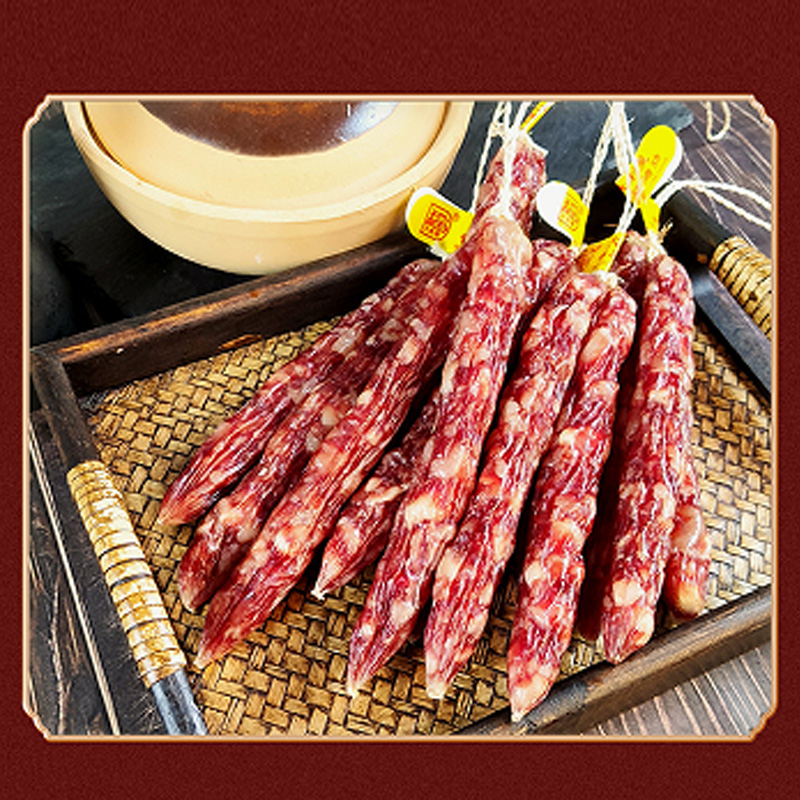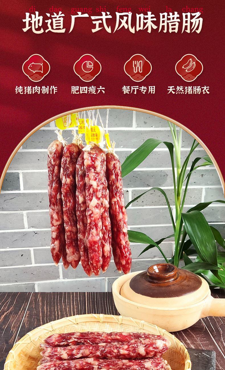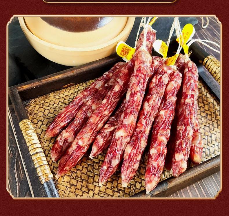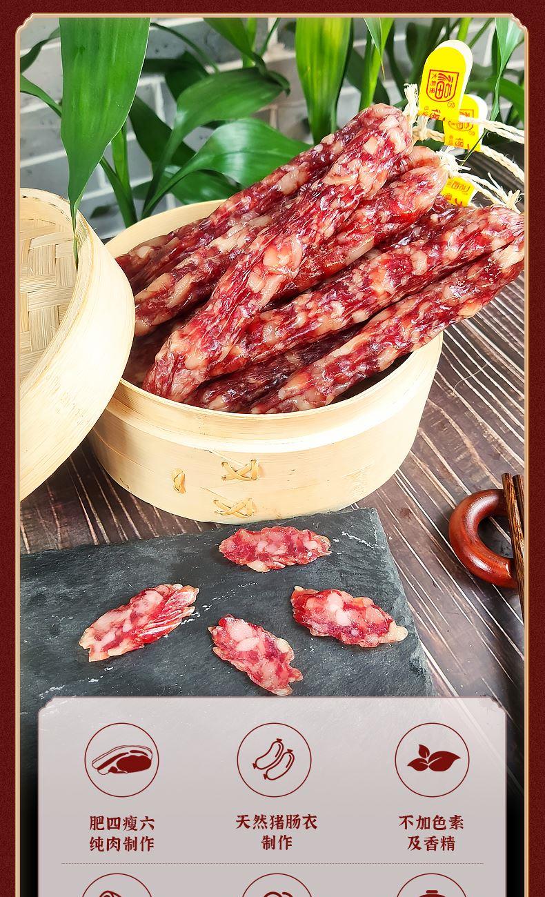 食用方式]加工后食用 【保存方式]常温保存,冷藏更佳 [主要配料]猪肉、白砂糖、食用盐、蒸馏酒、 天然肠衣、味精、食品添加剂(亚硝酸钠) [温馨提示] 腊肠非熟食,需二次加工煮熟后方可食用。