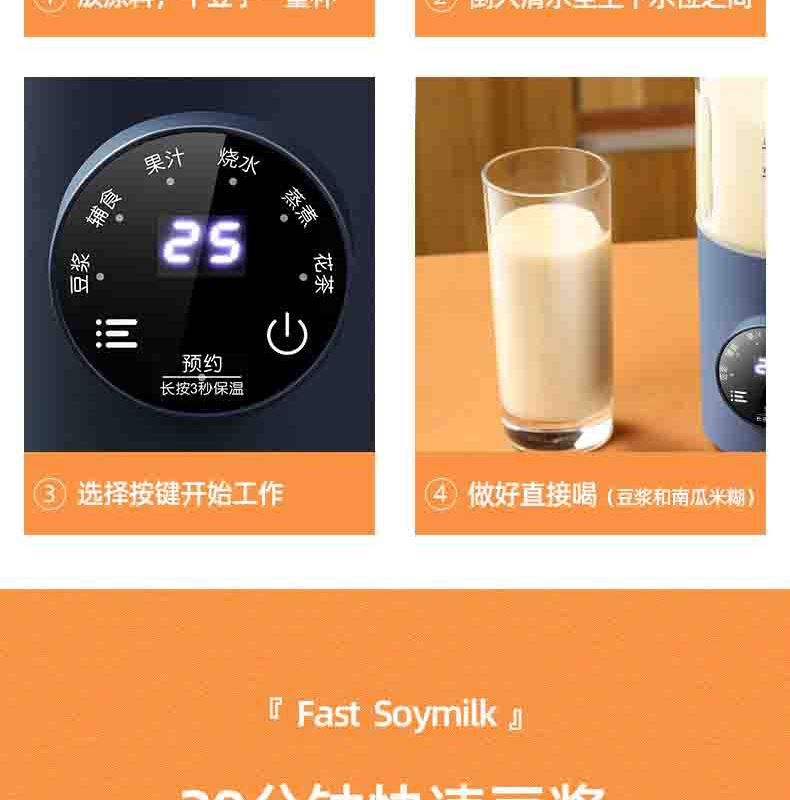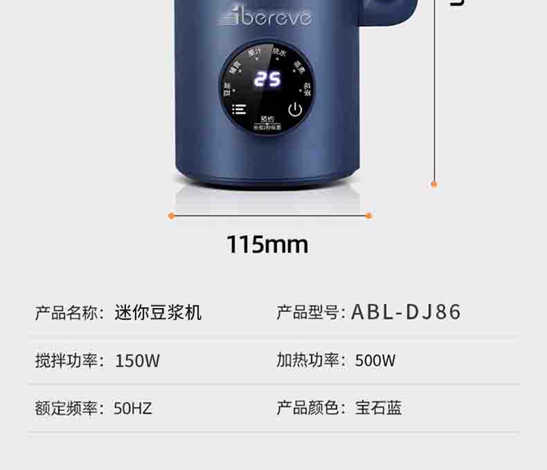 产品型号:ABL-DJ86 额定电源:220V/50Hz 搅拌功率:150W 加热功率:500W 产品重量:1.9Kg 产品材质:高硼硅玻璃杯体+ 304不锈钢刀+PP_x005f产品尺寸:115*265mm 包装尺寸:150*150*290MM 装箱数量:单台为包装箱;8台/箱