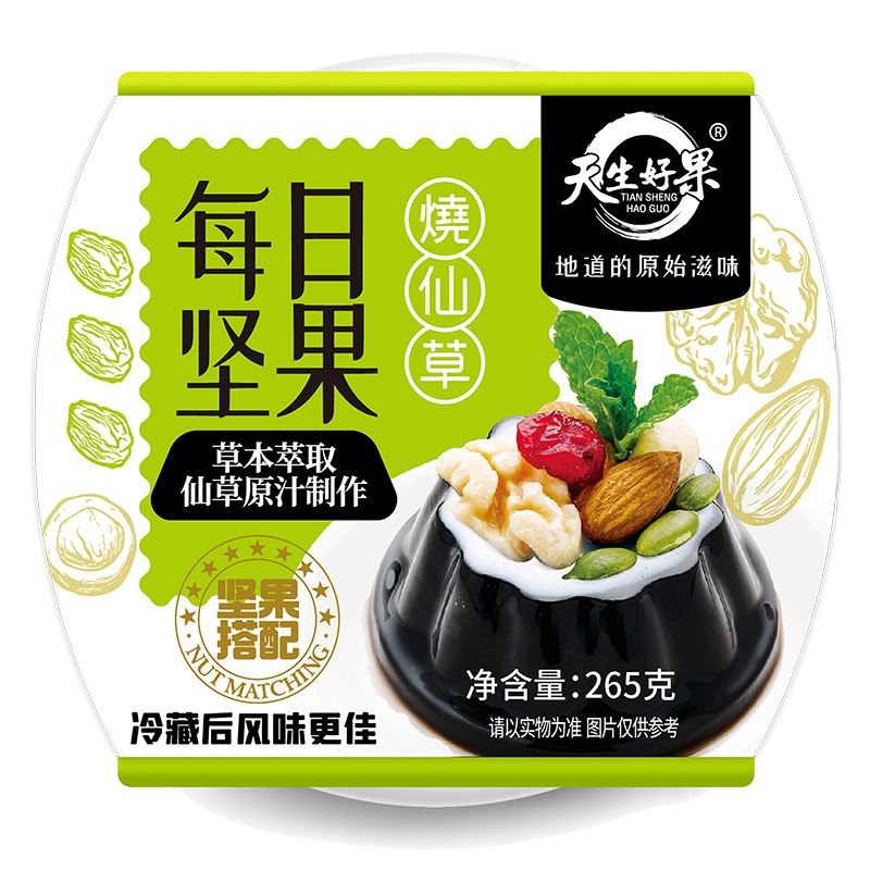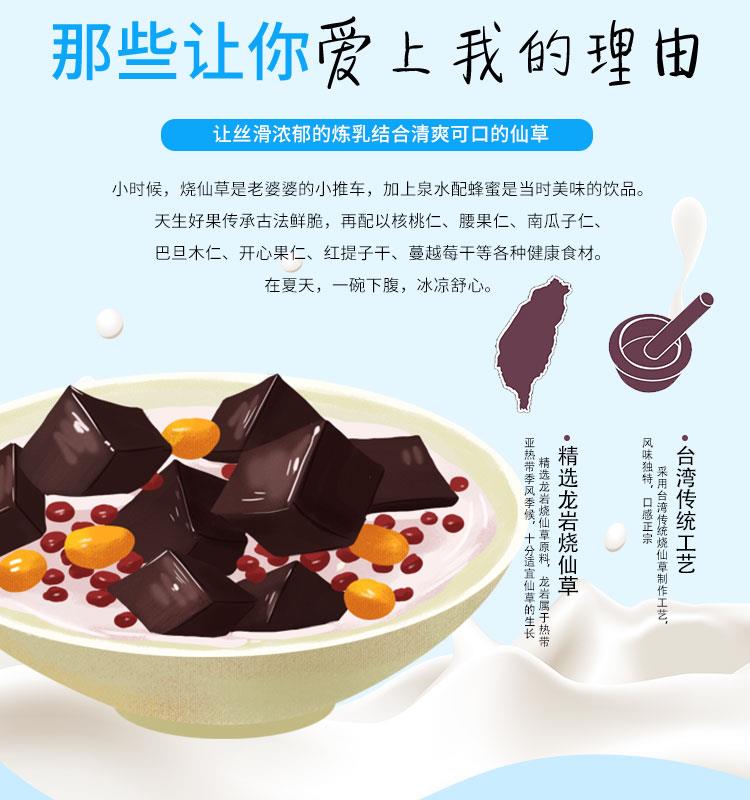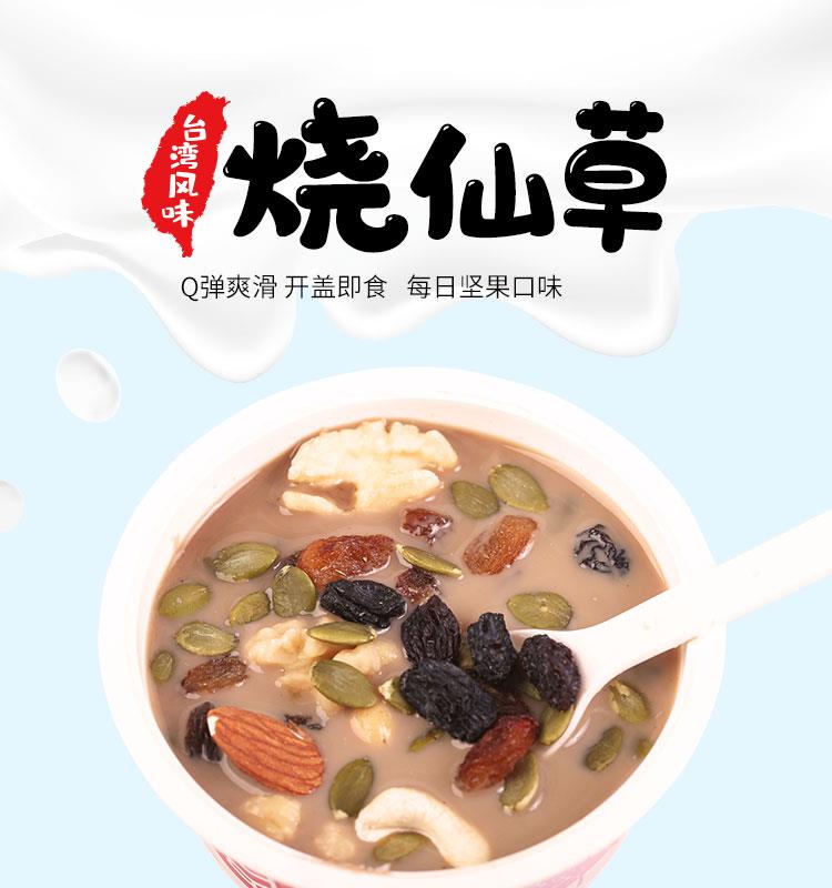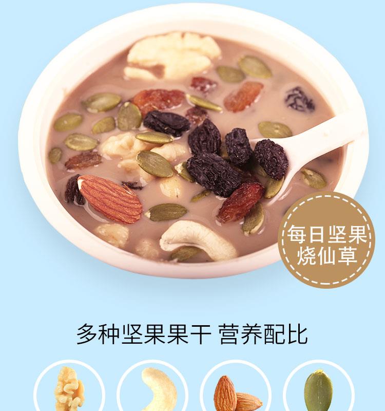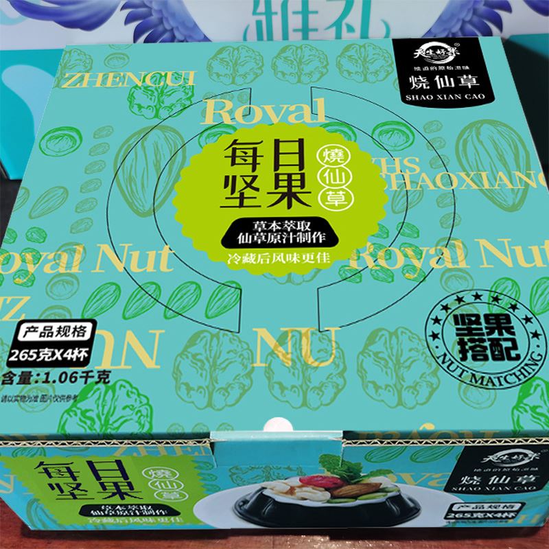 彩盒尺寸:23×23×10cm 内容物: 每日坚果烧仙草 265克X4杯 单杯净含量:265克 仙草冻:235克 熊猫牌炼乳:12克 每日坚果:10克 综合果粒:8克