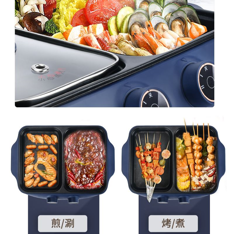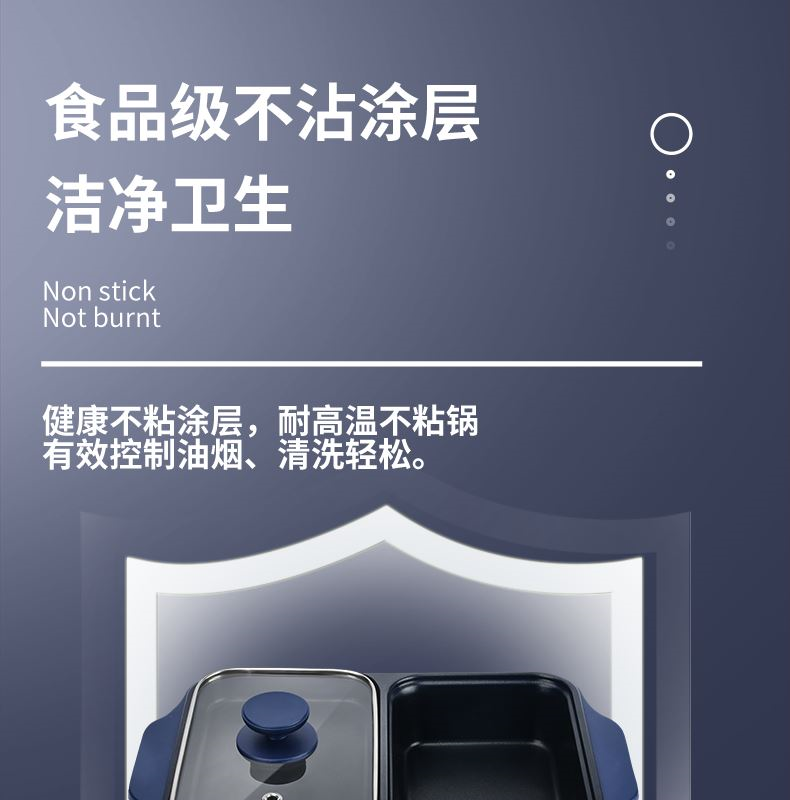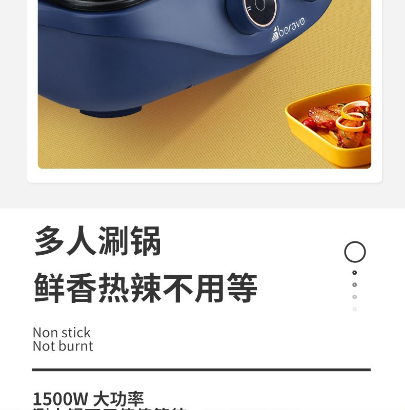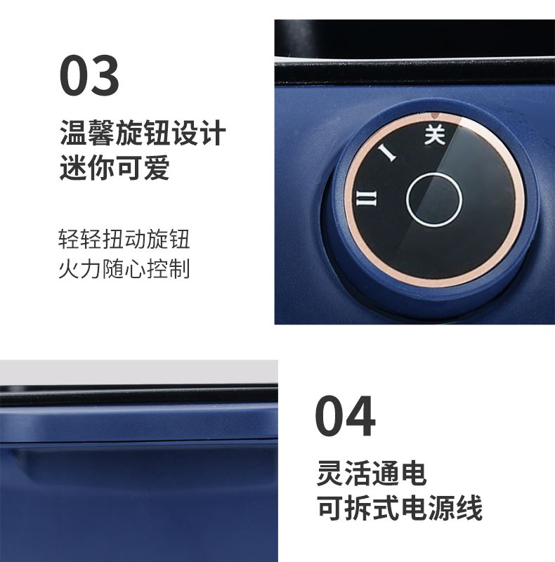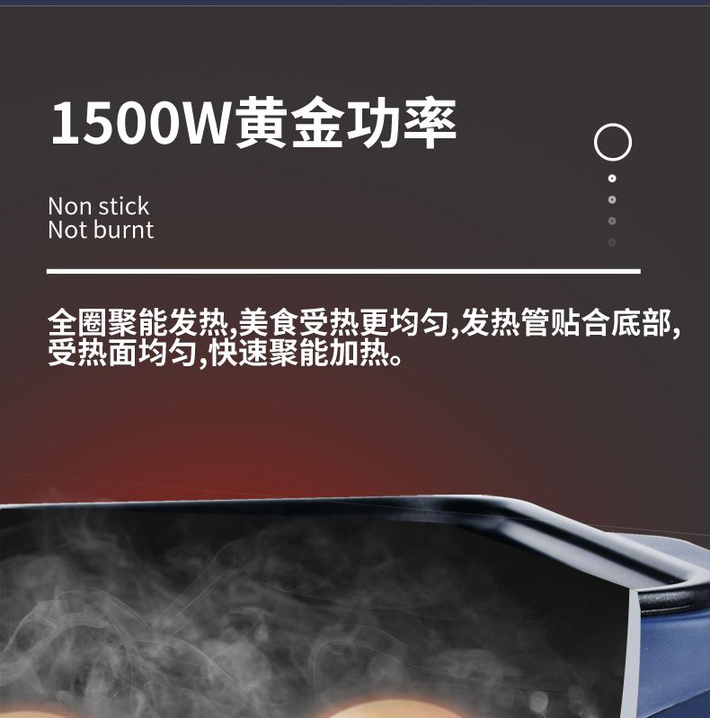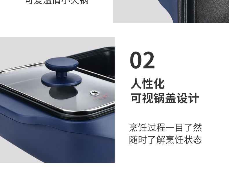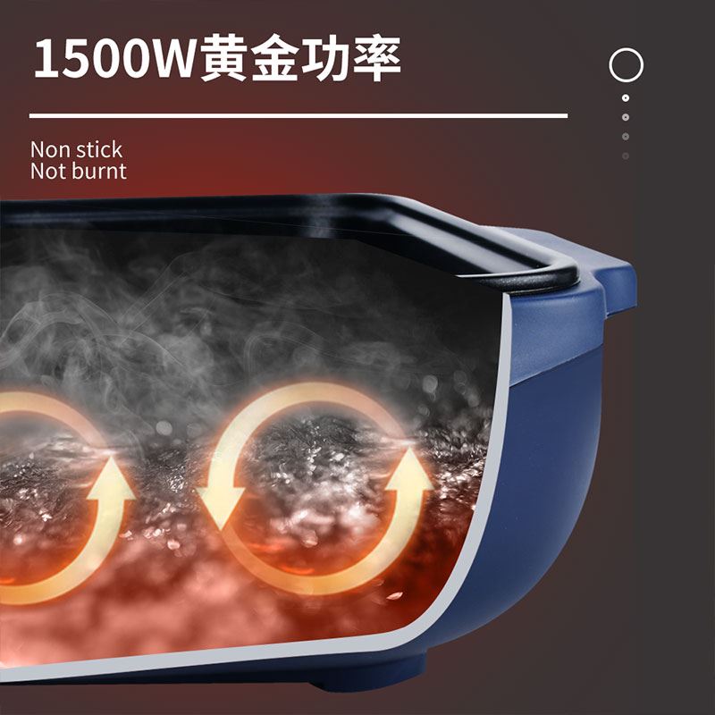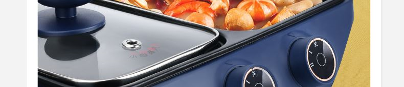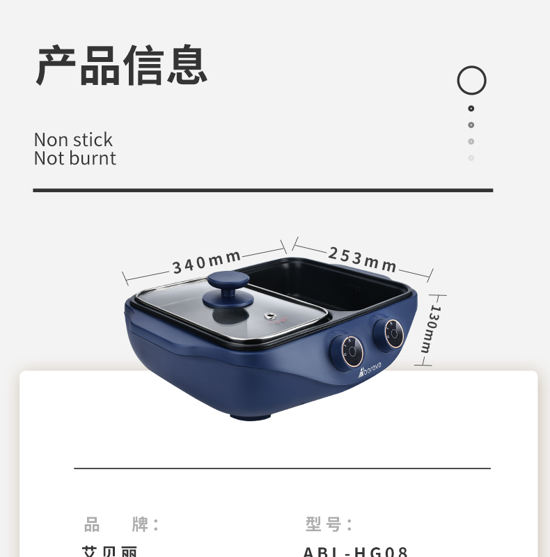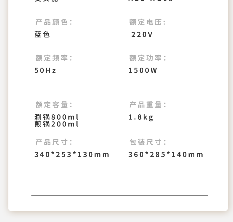 产品型号:ABL-HG08 产品颜色:蓝色 额定功率:1500W 额定容量:涮锅800ml,煎锅200ml 额定电压:220V~ 额定频率:50Hz 产品毛重:1.8KG 产品尺寸:340*253*130mm 包装尺寸:360*285*140mm 装箱数量:单台为彩盒包装箱;8台/箱