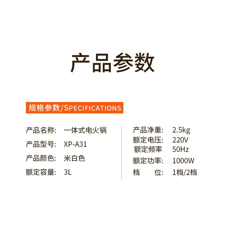 产品型号:XP-A31 产品颜色:米白色 产品容量:3L 额定功率:1000W 额定电压:220V~ 产品毛重:1.5KG 产品尺寸:320*270*170MM 包装尺寸:340*162*310MM 装箱数量:单台为彩盒包装箱;6台/箱