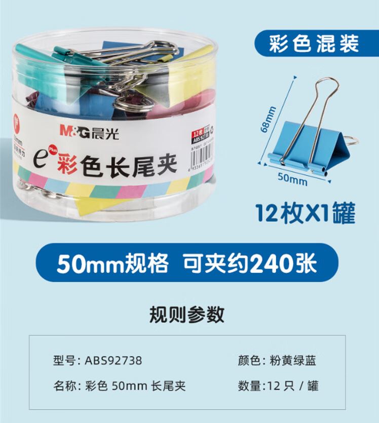 晨光长尾夹Eplus50mm(筒装)彩色ABS92738