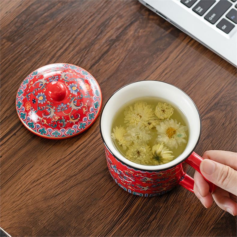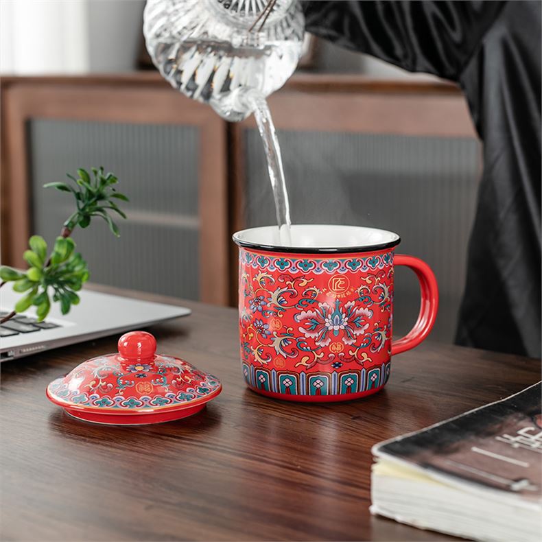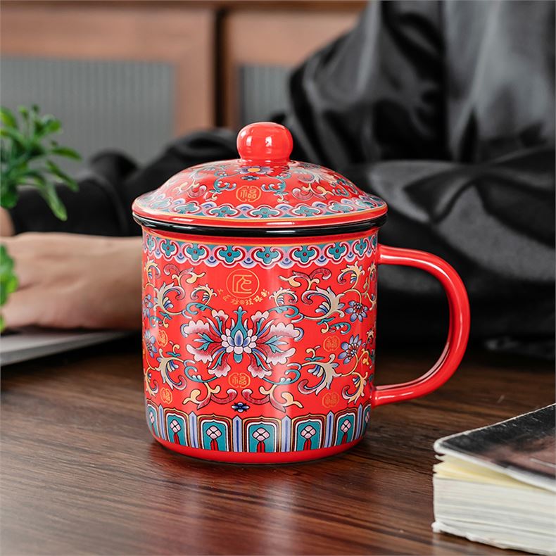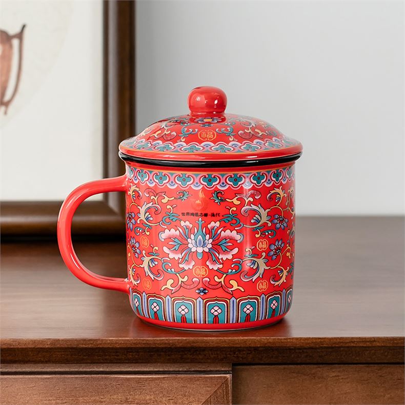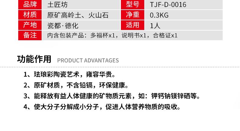 产品型号:TJF-D-0016 产品容量:600ML 礼盒规格:16x16x16.9cm 产品净重:0.8kg 装箱数量:30个/箱 功能结构:原矿陶瓷 主体材质:进口火山岩、稀土、矿石、高岭土 产品描述 1.珐琅彩陶瓷艺术,雍容华贵。 2.原矿材质,不含铅镉,环保健康。 3.能释放有益人体健康的矿物质素,如:钙钾钠镁锌硒等。 4.使大分子分解成小分子,促进人体营养物质吸收。