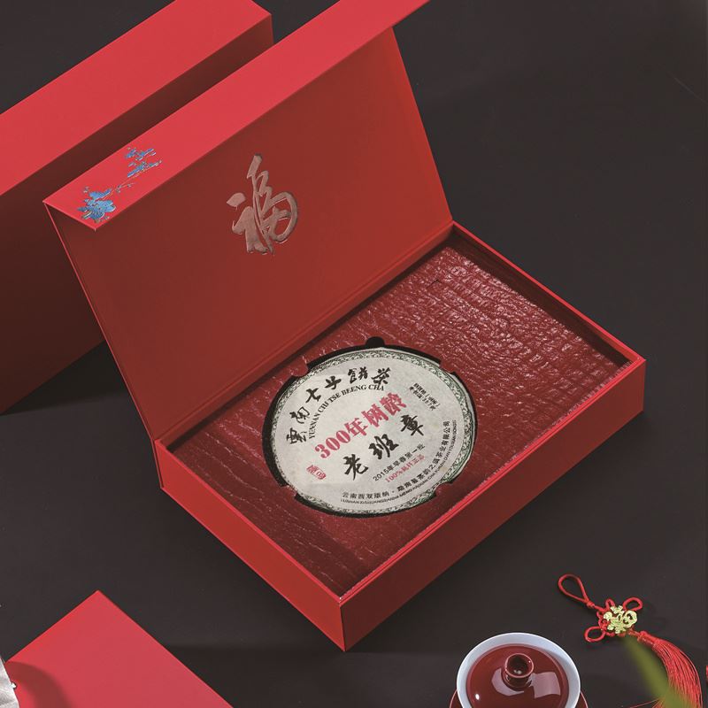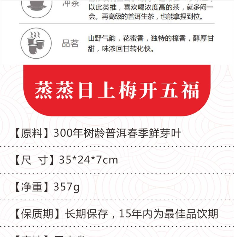 产品品名:梅开五福老班章生普 产品信息:2015年生普357g 规格:35*24*7cm 产地:西双版纳