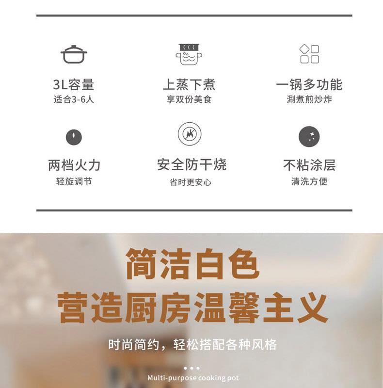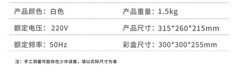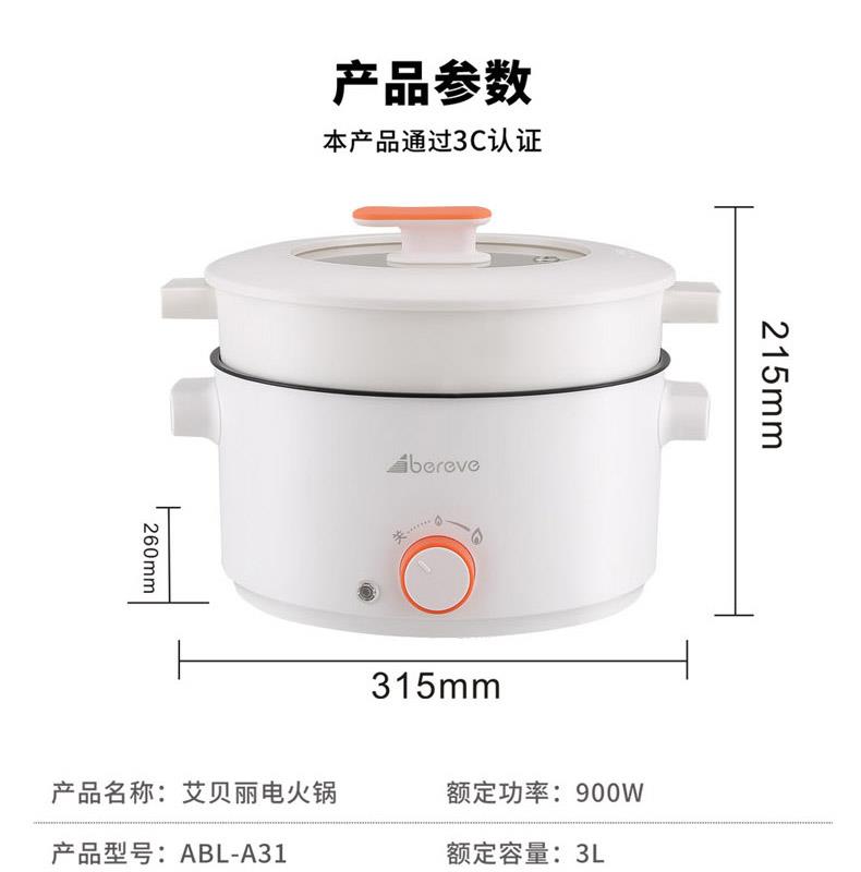 产品型号:ABL-A31 产品颜色:白色 额定功率:900W 额定电压:220V~ 额定容量:3L 产品重量:1.5KG 产品尺寸:315*260*215MM 彩盒尺寸:300*300*255MM 装箱数量:单台为彩盒包装箱;8个/箱
