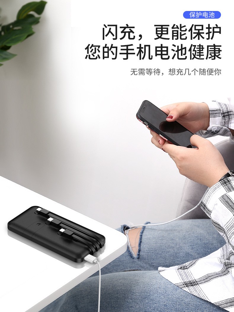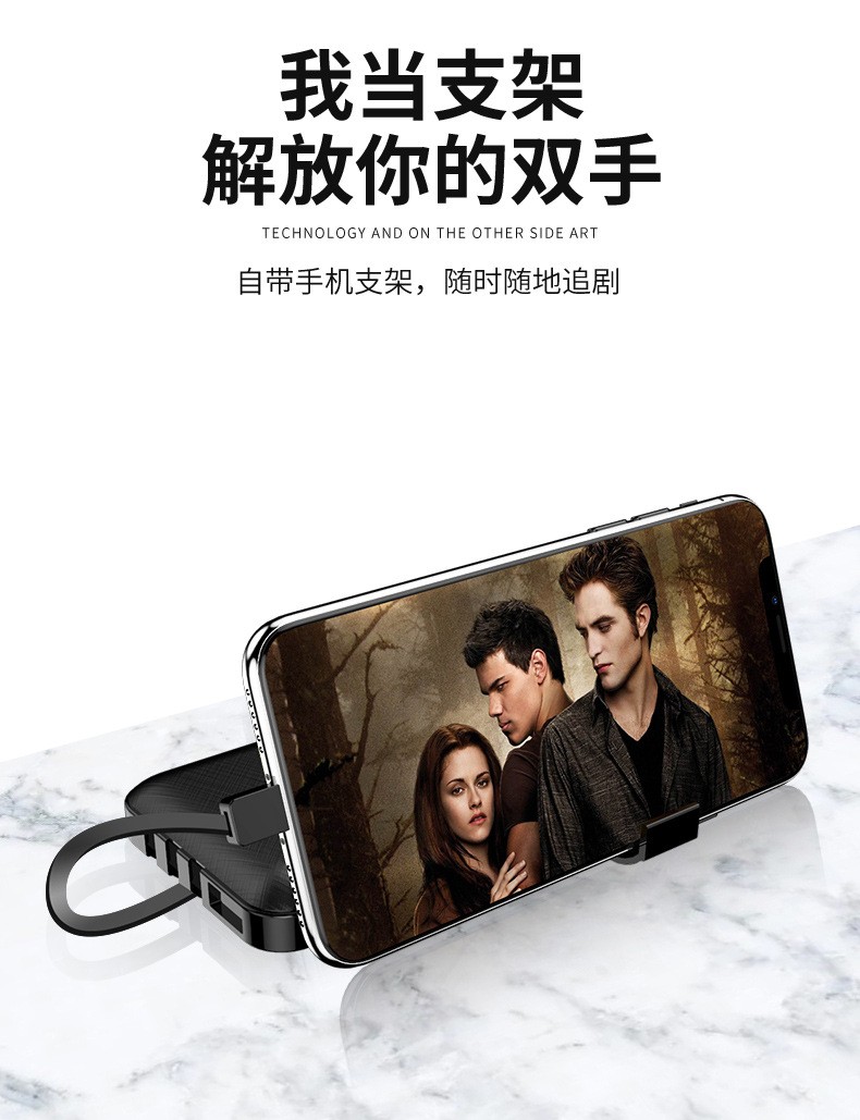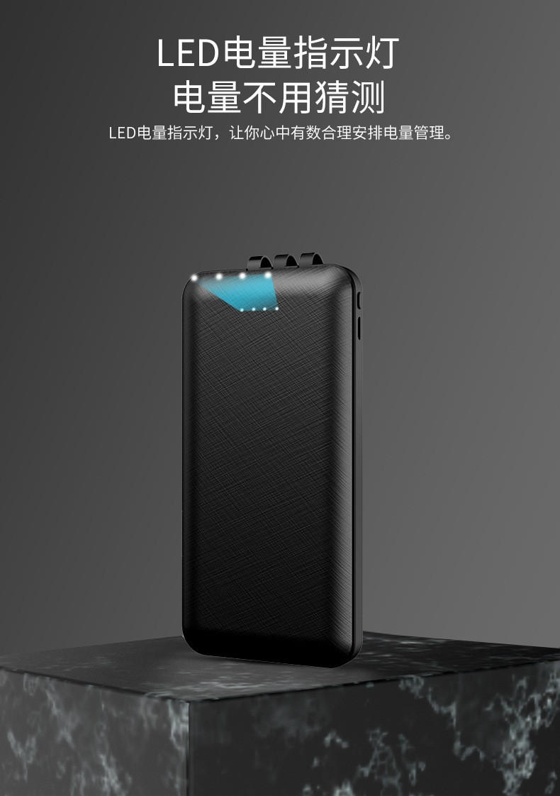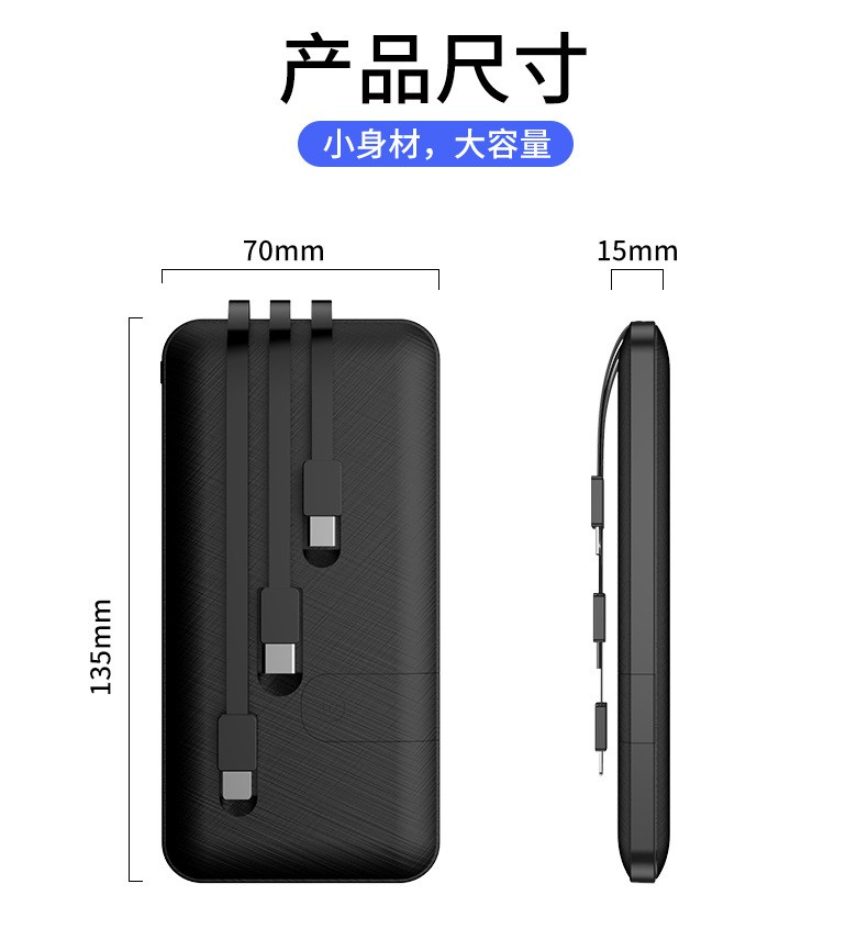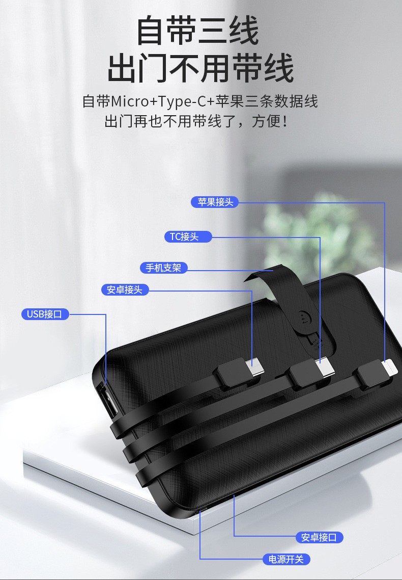 输出类型:自带线3口输出 充电电压:5V/2.1A 电池容量:10000mAh 电芯类型:聚合物电池电芯