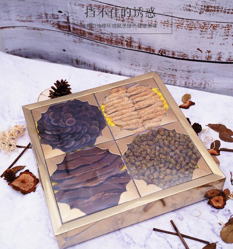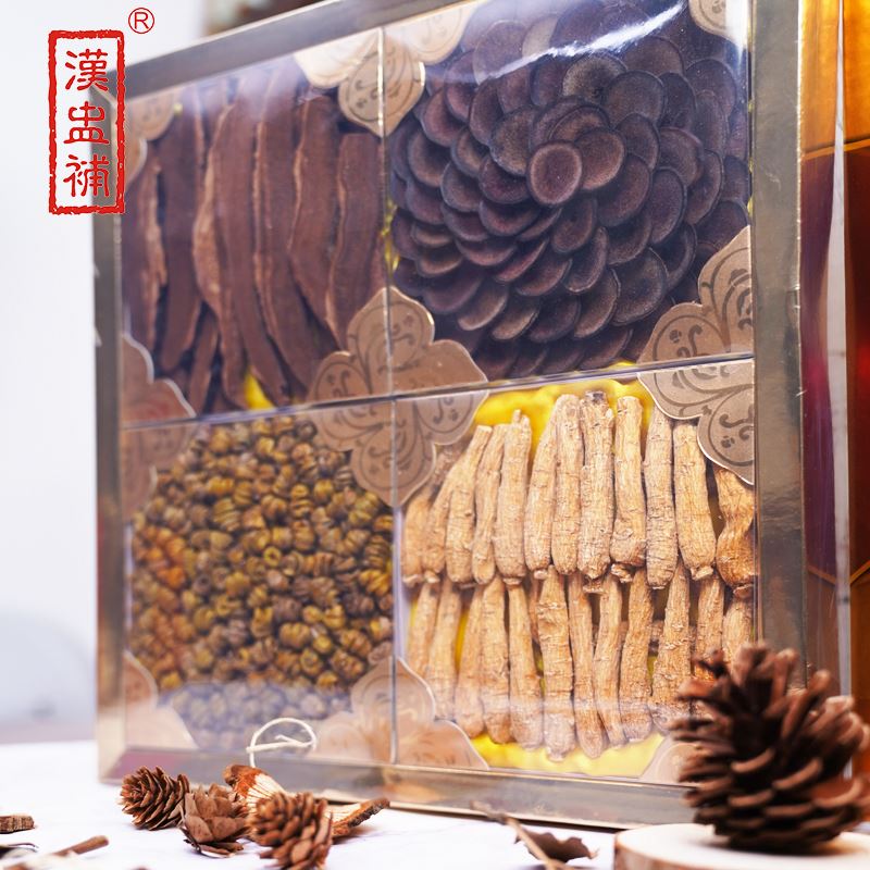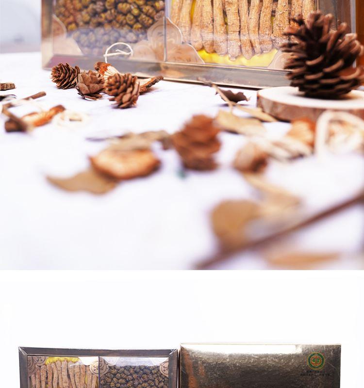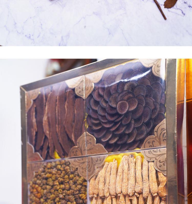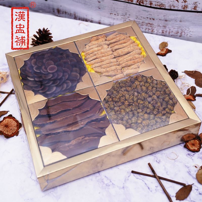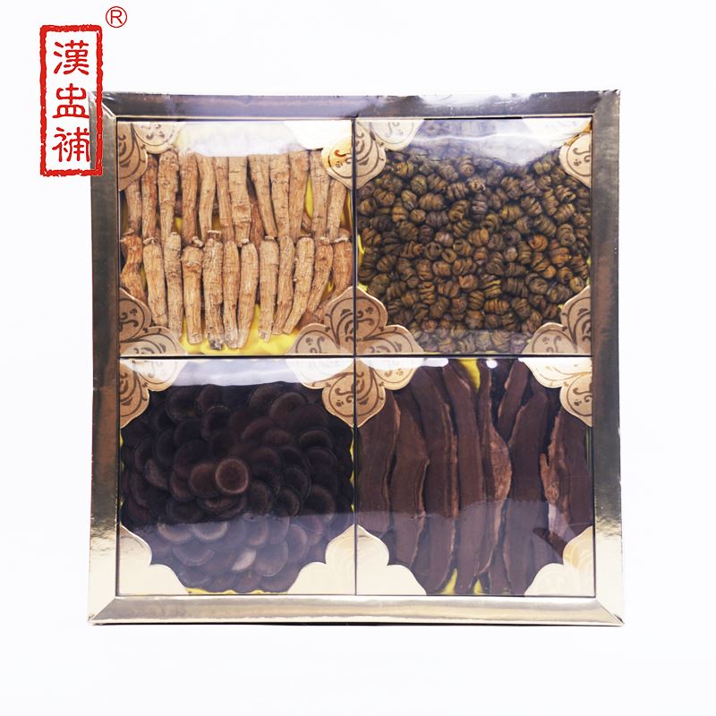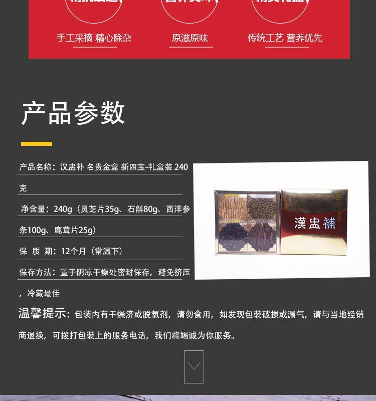 产品名称:汉盅补名贵金盒新四宝-礼盒装240克 净重:240g(灵芝片35g、石斛80g、西洋参条100g、鹿茸片25g) 规格:礼盒装