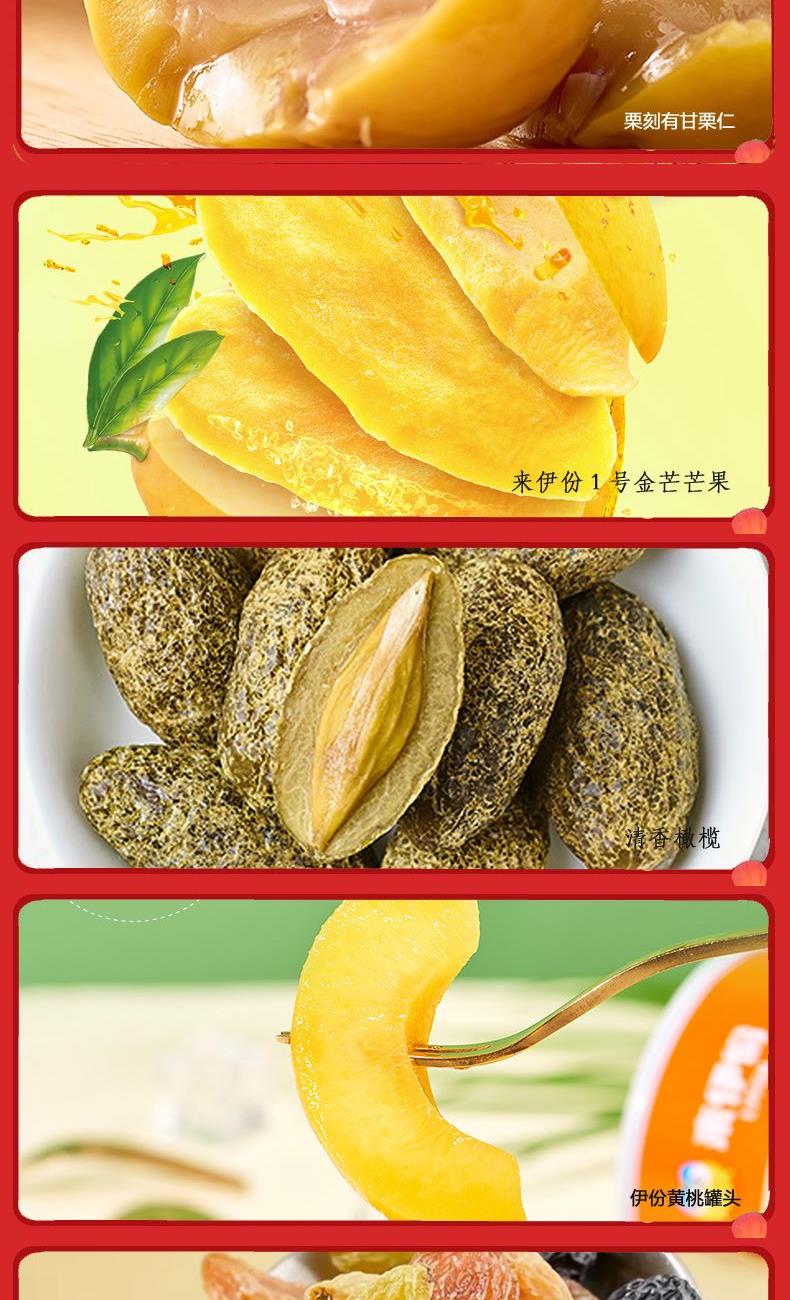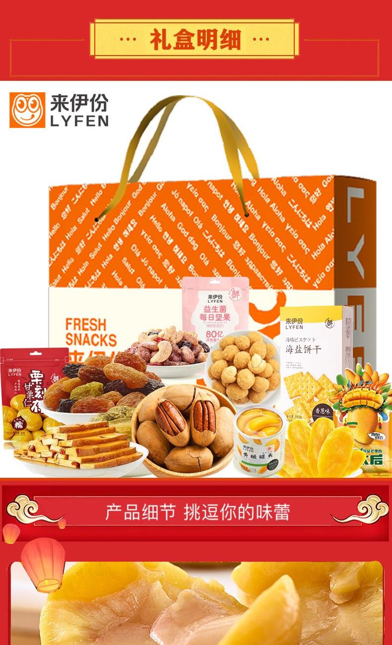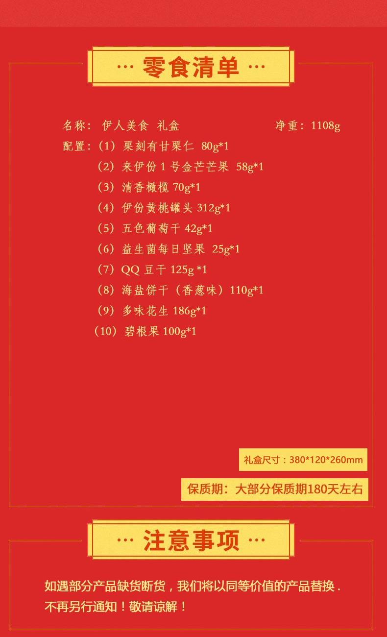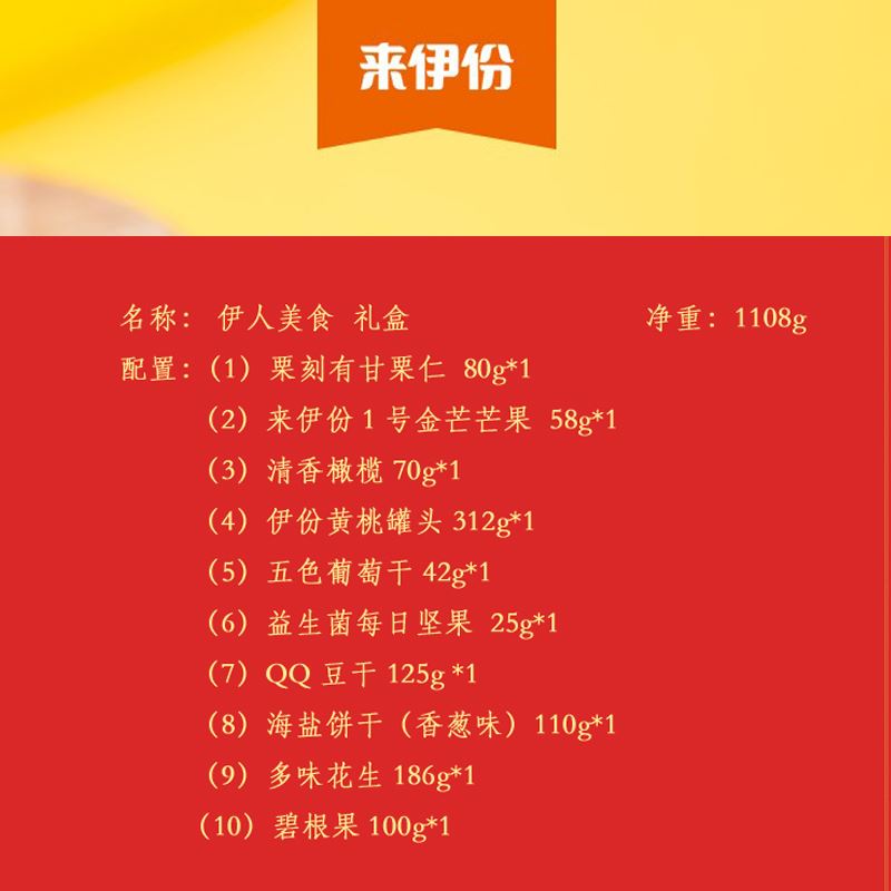 来伊份伊人美食礼盒1108g 栗刻有甘栗仁80g*1 来伊份1号金芒芒果肉58g*1 清香橄榄70g*1 QQ豆干125g*1 海盐饼干(香葱味)110g*1 多味花生186g*1 碧根果100g*1 伊份黄桃罐头312g*1 益生菌每日坚果25g*1 五色葡萄干42g*1