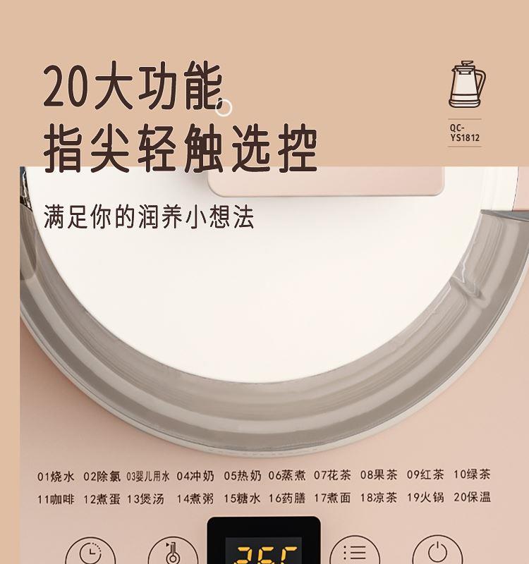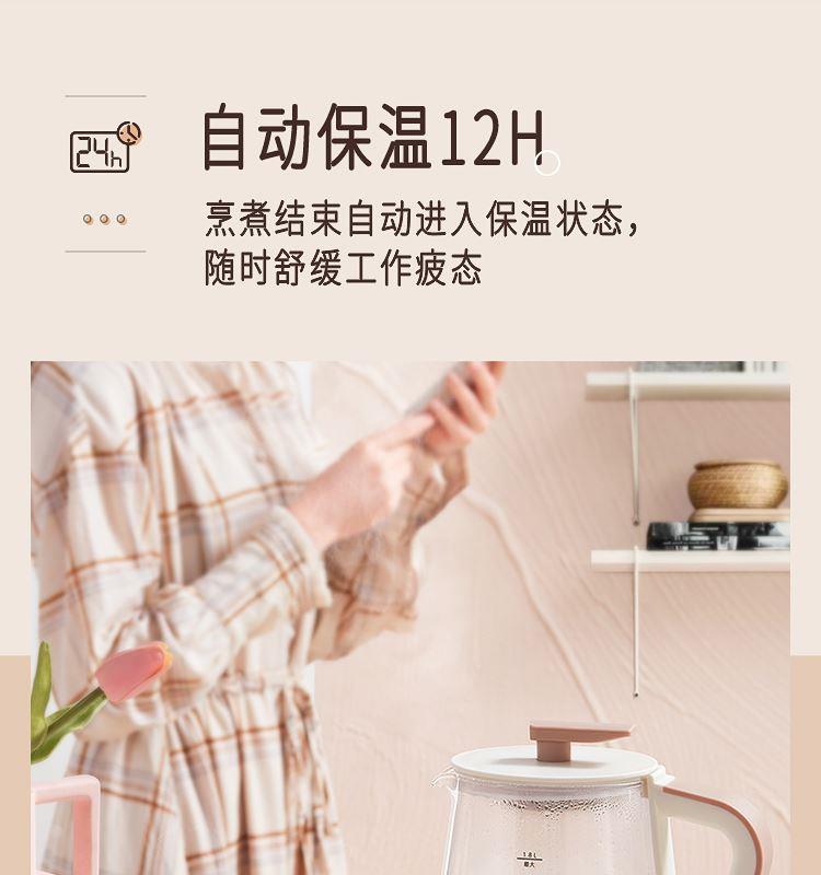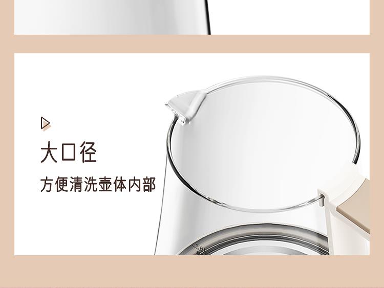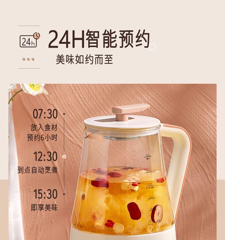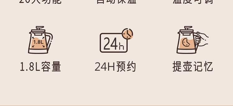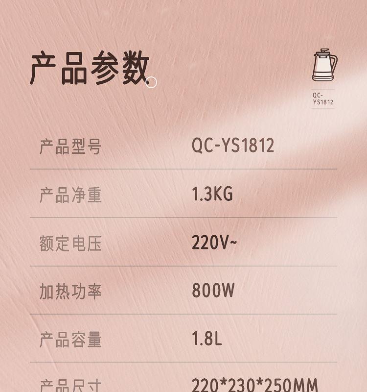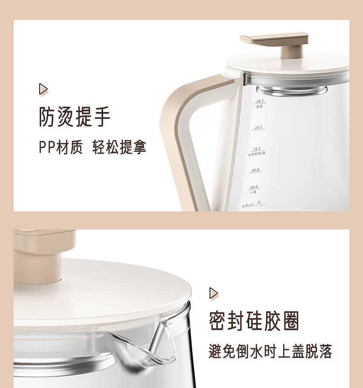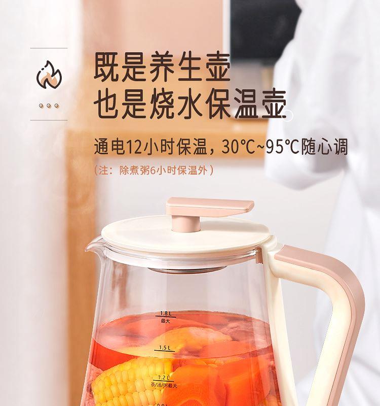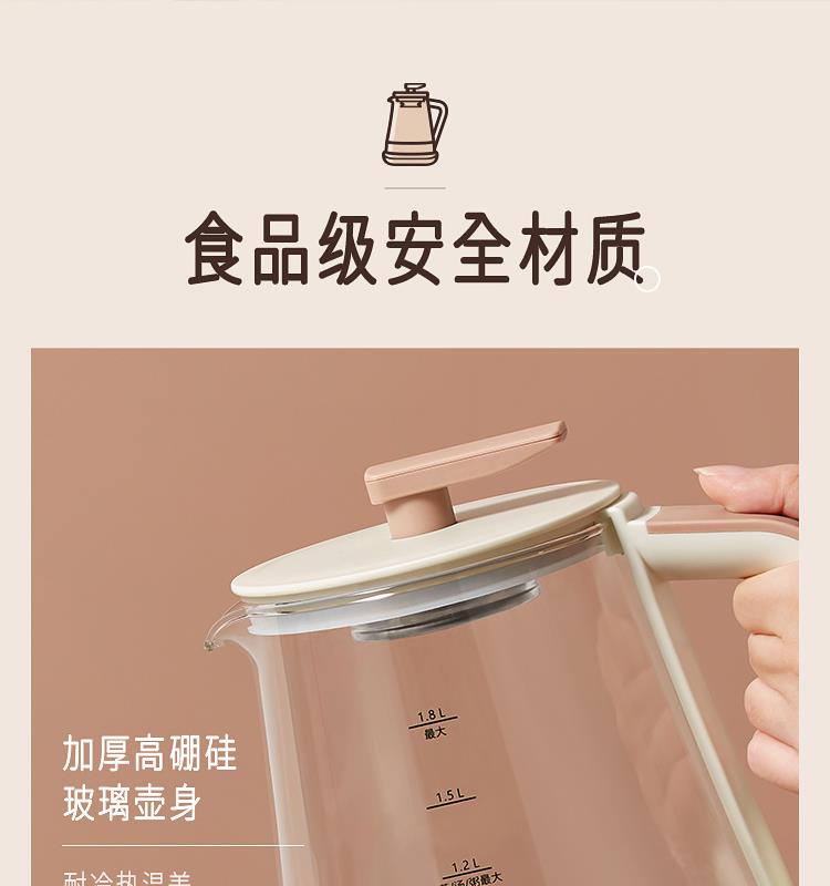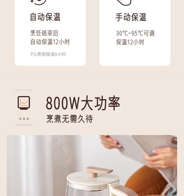 颜色:白色+米色 产品净重 :1.3kg 产品容量 :1.8L 额定电压(V) :220V~ 额定功率(W): 800W 产品尺寸:220*230*250mm 材质:高硼硅玻璃、304不锈钢、PP