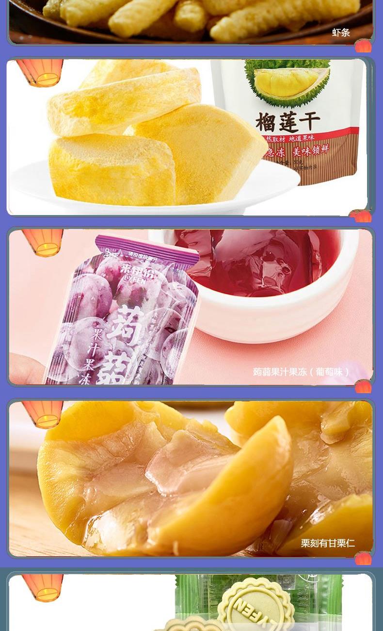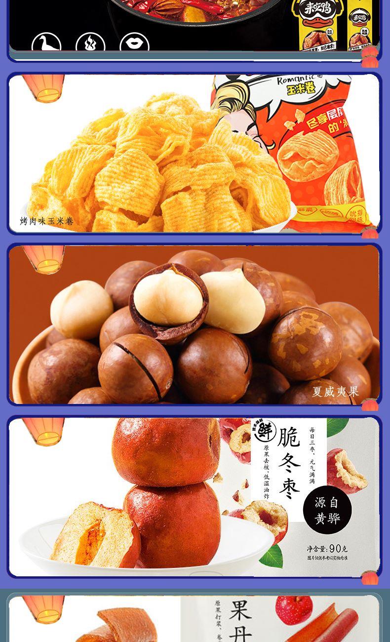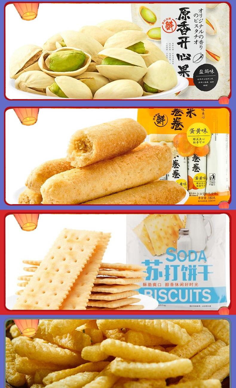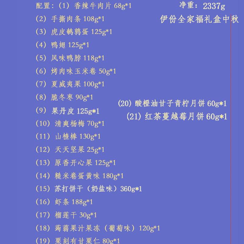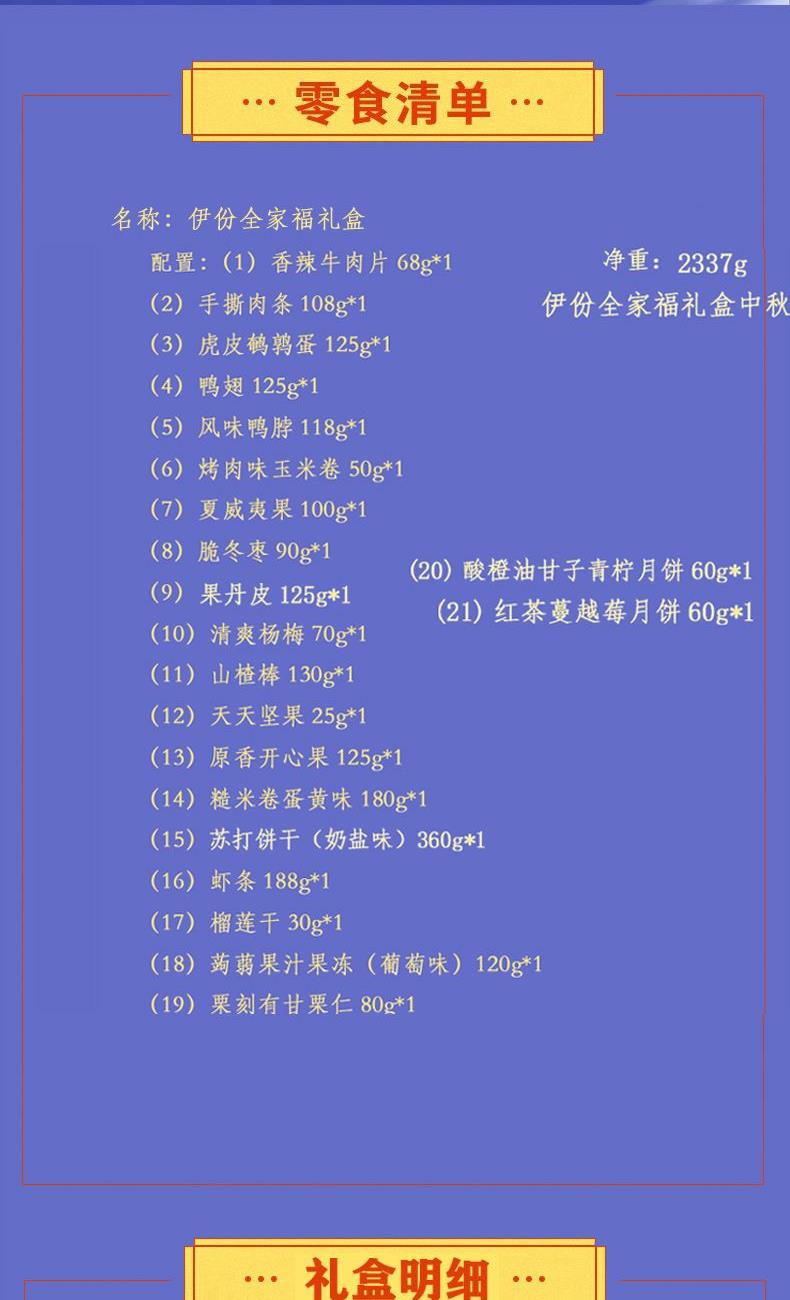 来伊份伊份全家福礼盒2217g 香辣牛肉片68g*1 手撕肉条108g*1 虎皮鹌鹑蛋125g*1 鸭翅125g*1 风味鸭脖118g*1 烤肉味玉米卷50g*1 夏威夷果100g*1 脆冬枣90g*1 果丹皮125g*1 清爽杨梅70g*1 山楂棒130g*1 益生菌每日坚果25g*1 原香开心果125g*1 糙米卷蛋黄味180g*1 苏打饼干(奶盐味)360g*1 虾条188g*1 榴莲干30g*1 蒟蒻果汁果冻(葡萄味)120g*1 栗刻有甘栗仁80g*1
