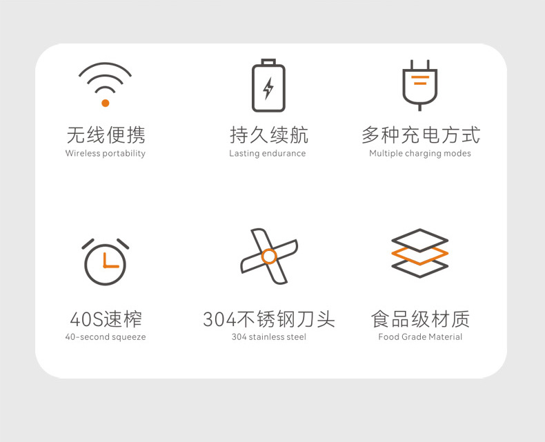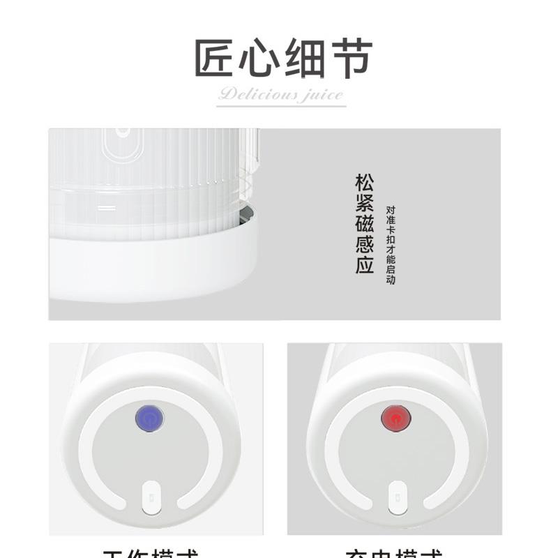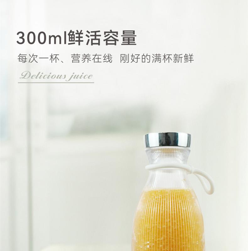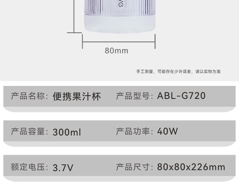 产品型号:ABL-G720 产品颜色:白色 额定容量:300ML 额定功率:40W 额定电压:3.7V 产品重量:0.52KG 产品材质:pc杯身+304不锈钢刀片 产品尺寸:80*80*226MM 彩盒尺寸:105*105*260MM 装箱数量:单台为彩盒包装箱;50个/箱