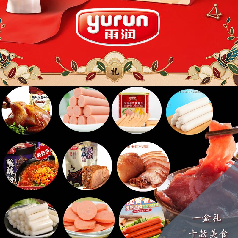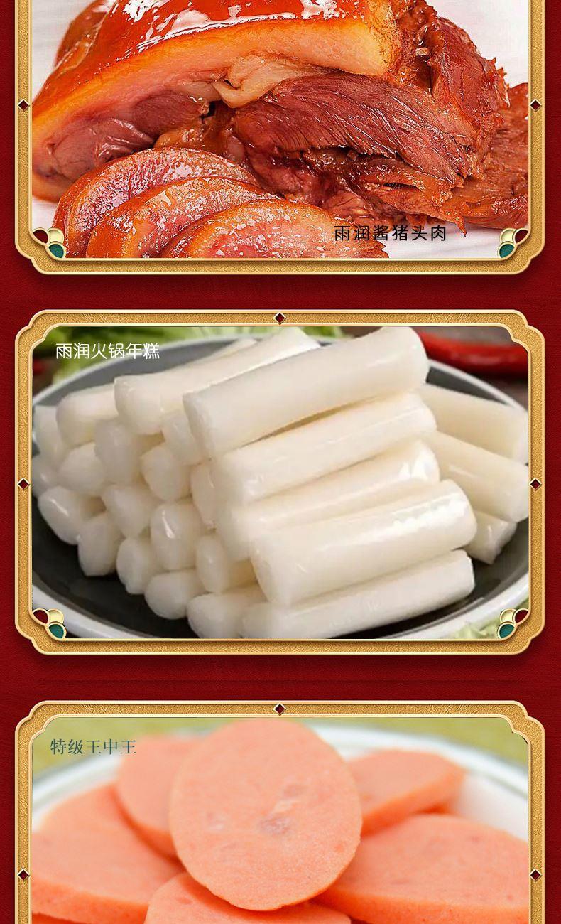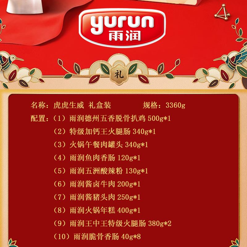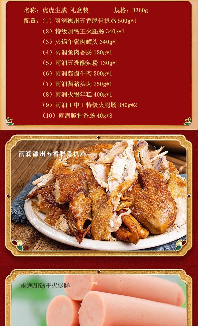 雨润虎虎生威3360g礼盒装 (1)雨润德州五香脱骨扒鸡500g*1 (2)特级加钙王火腿肠340g*1 (3)火锅午餐肉罐头340g*1 (4)雨润鱼肉香肠120g*1 (5)雨润五洲酸辣粉130g*1 (6)雨润酱卤牛肉200g*1 (7)雨润酱猪头肉250g*1 (8)雨润火锅年糕400g*1 (9)雨润王中王特级火腿肠380g*2 (10)雨润脆骨香肠40g*8