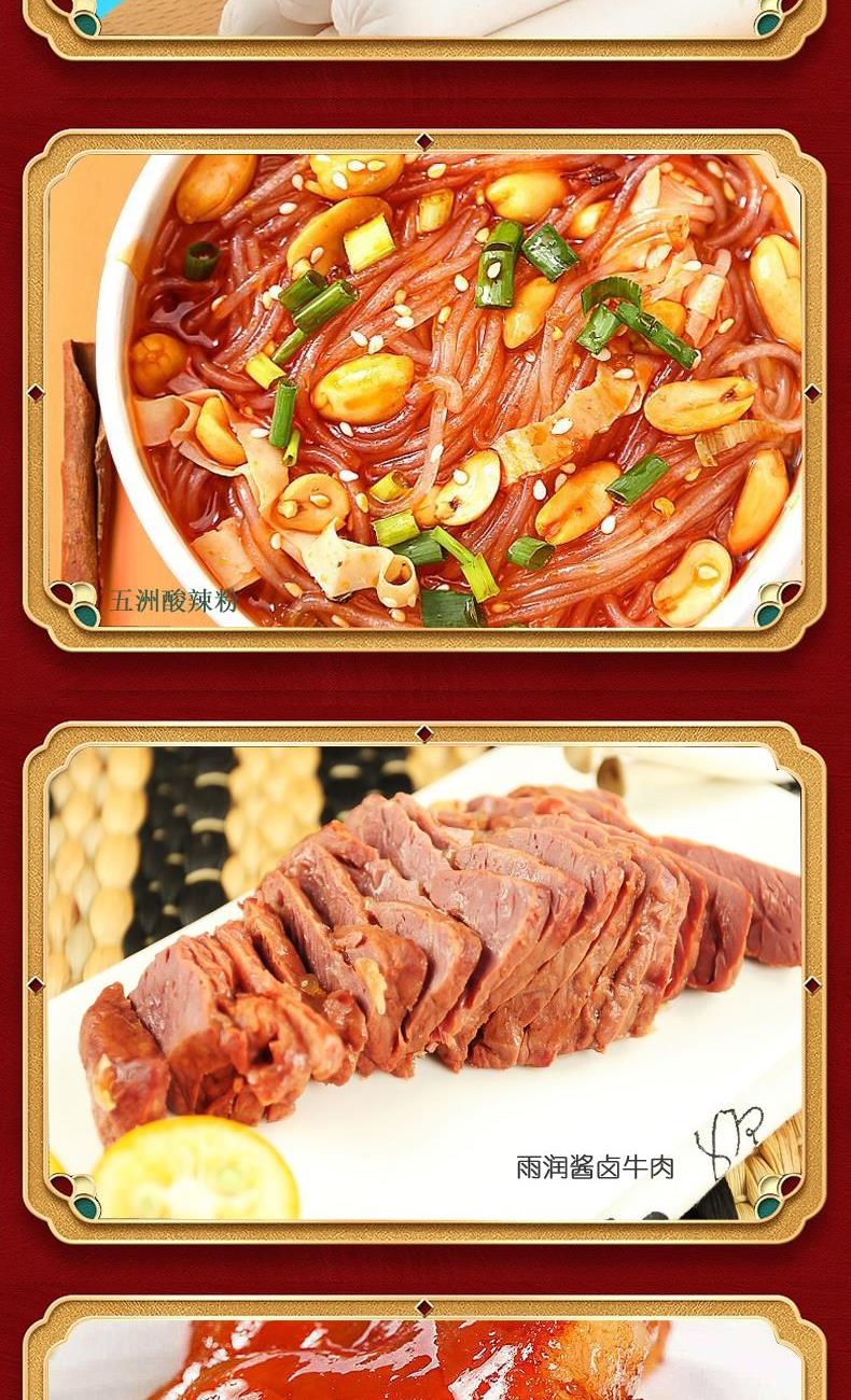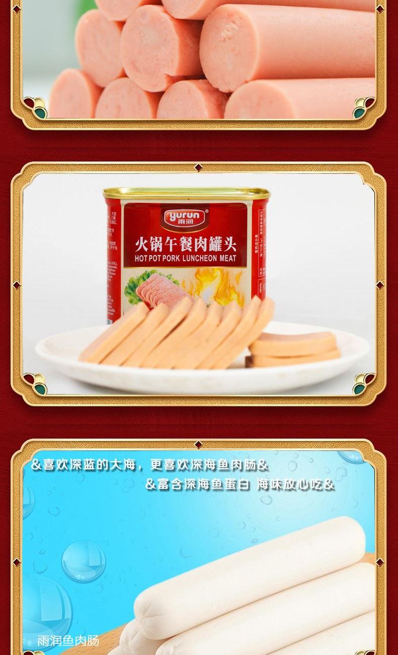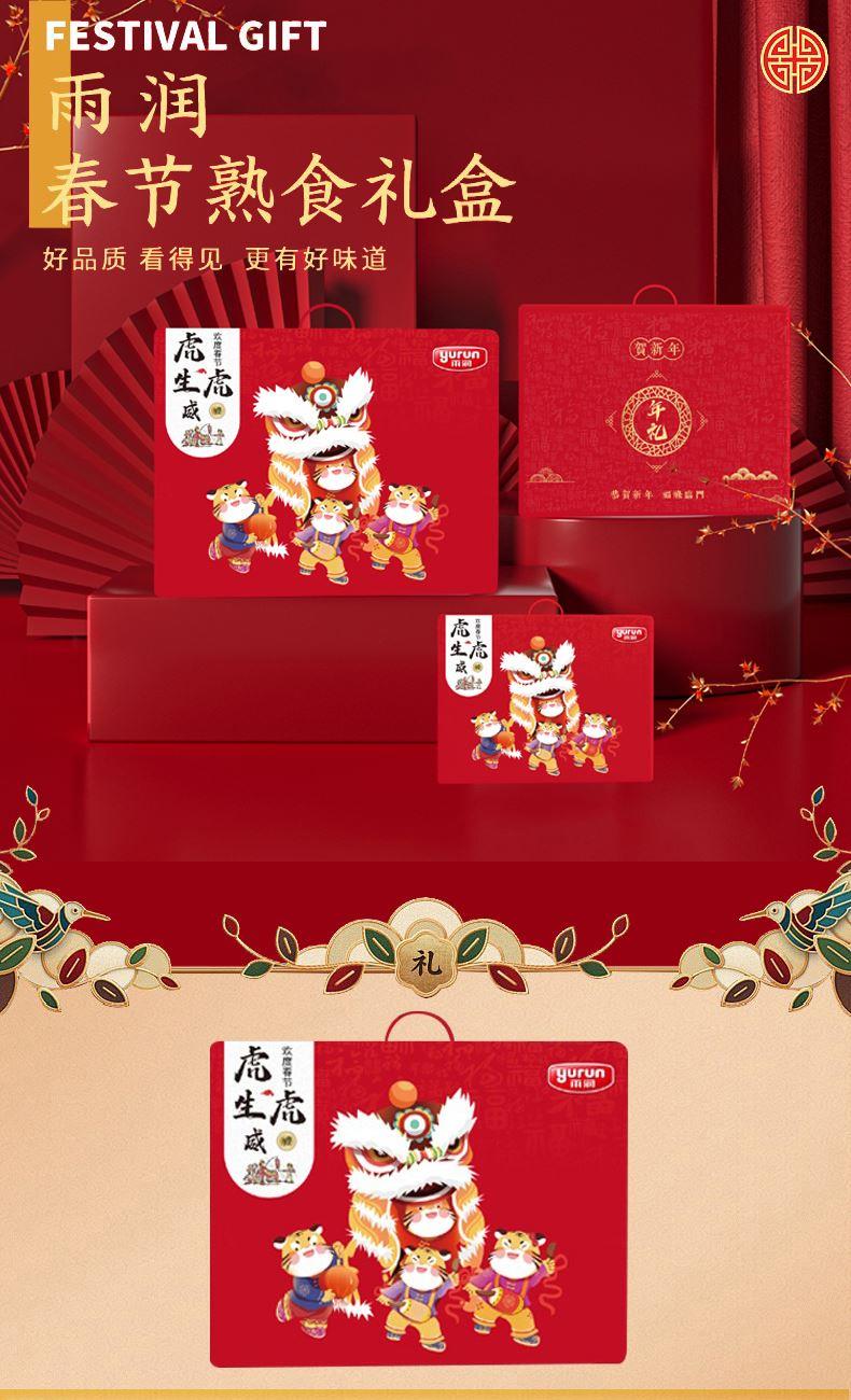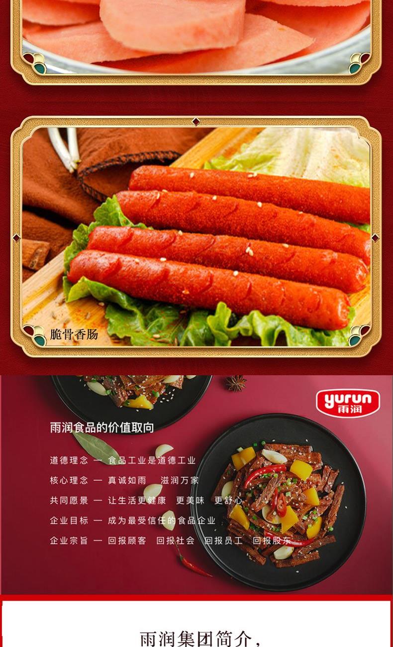 雨润虎虎生威3360g礼盒装 (1)雨润德州五香脱骨扒鸡500g*1 (2)特级加钙王火腿肠340g*1 (3)火锅午餐肉罐头340g*1 (4)雨润鱼肉香肠120g*1 (5)雨润五洲酸辣粉130g*1 (6)雨润酱卤牛肉200g*1 (7)雨润酱猪头肉250g*1 (8)雨润火锅年糕400g*1 (9)雨润王中王特级火腿肠380g*2 (10)雨润脆骨香肠40g*8