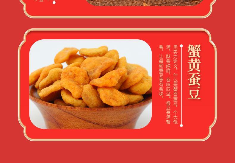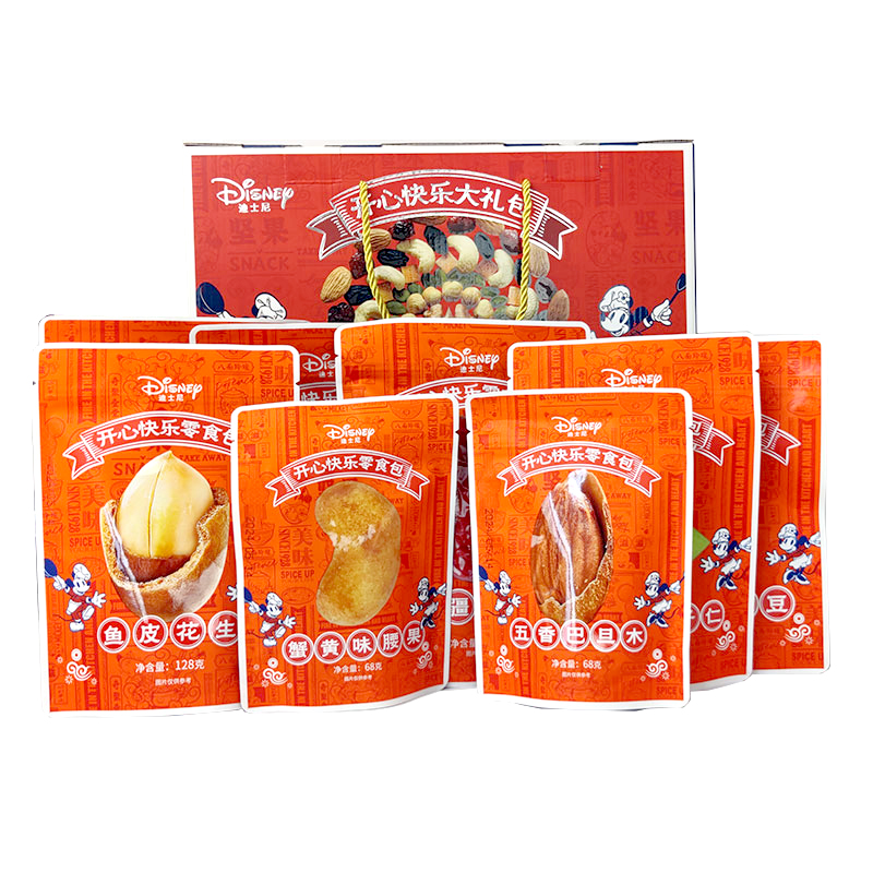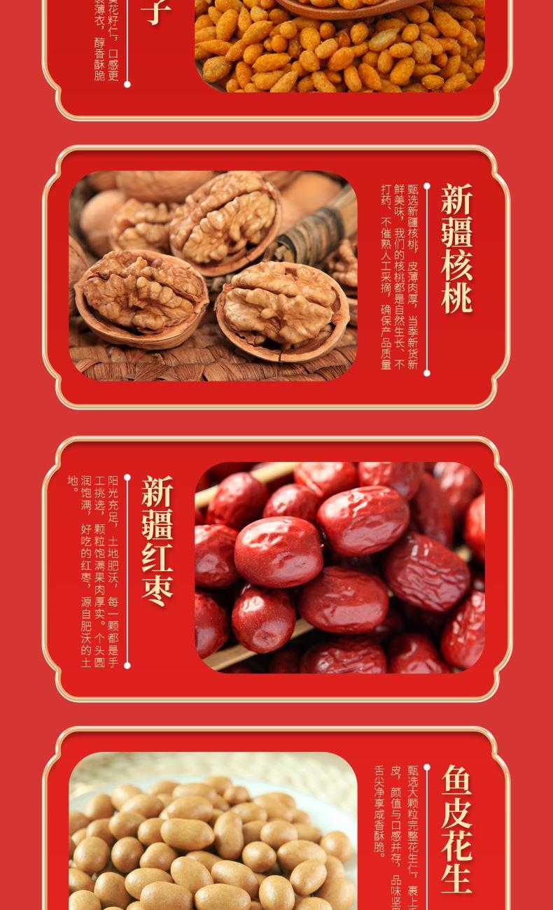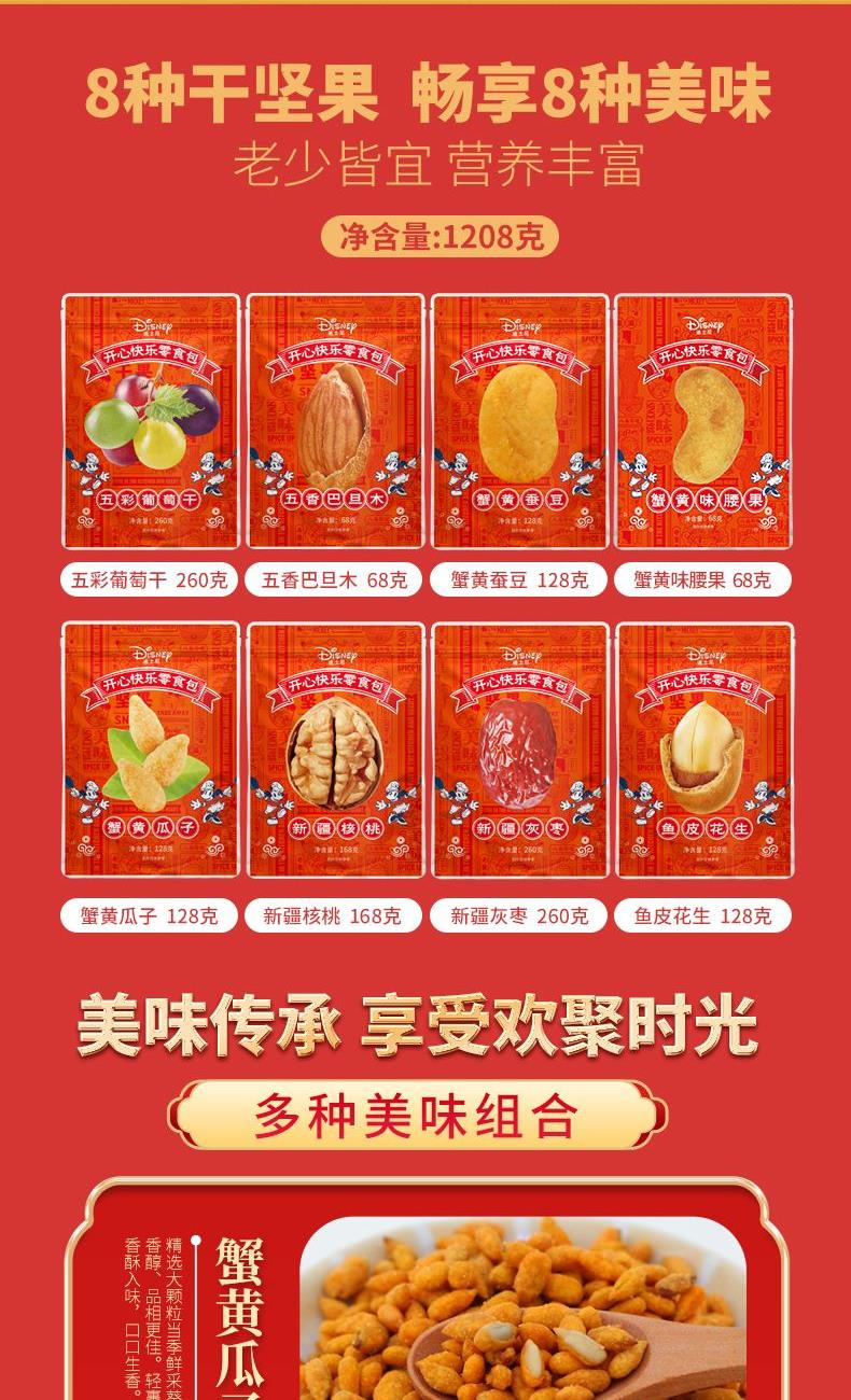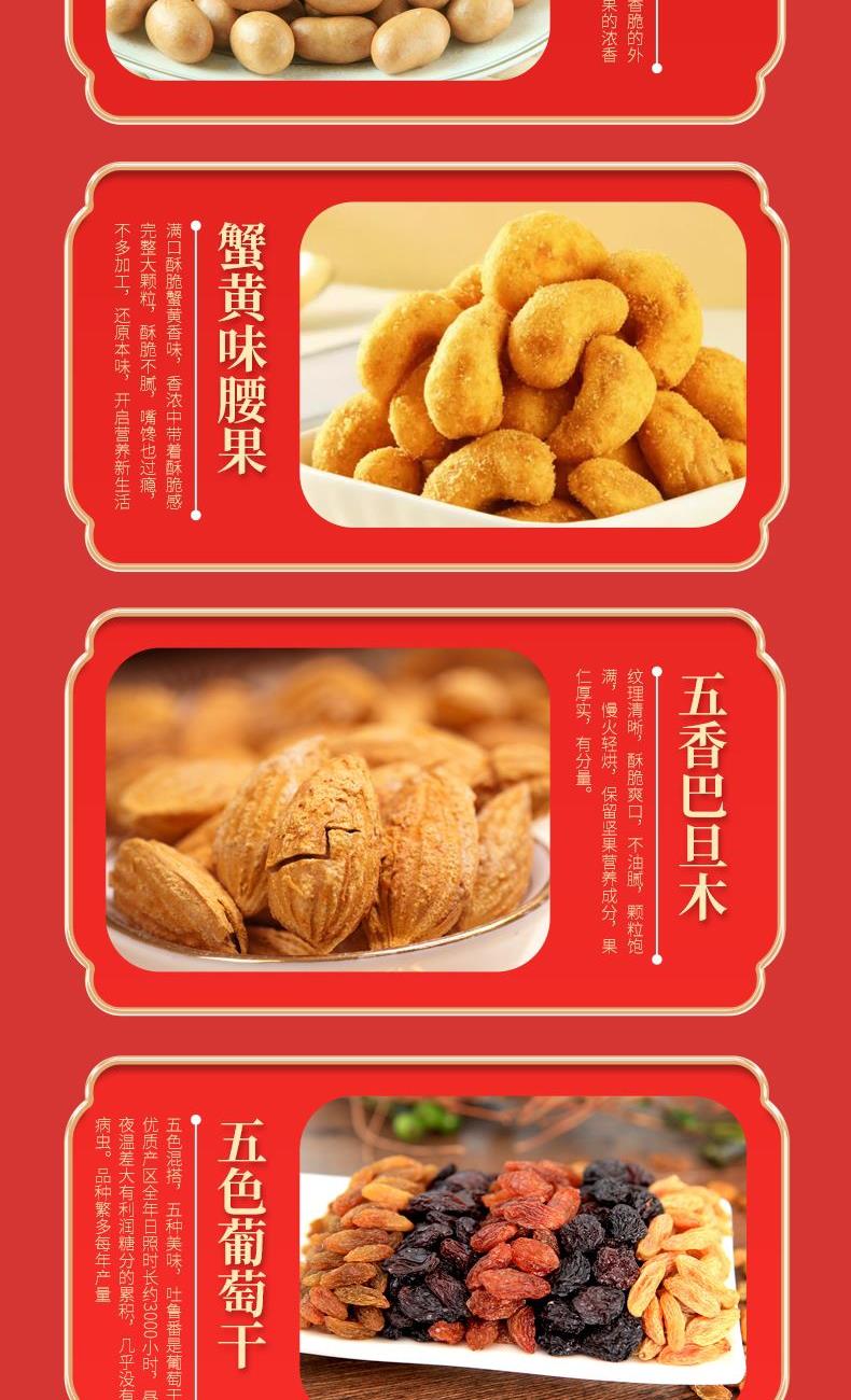 炭烤腰果68g,五彩葡萄干260g,五香巴旦木68g,蟹黄蚕豆128g,蟹黄瓜子128g,新疆核桃168g,新疆灰枣260g,鱼皮花生128g