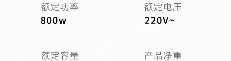 产品颜色:白色 产品容量:3L 产品净重:1.3kg 彩盒尺寸:265*265*170mm 额定电压:220V 额定功率: 800W