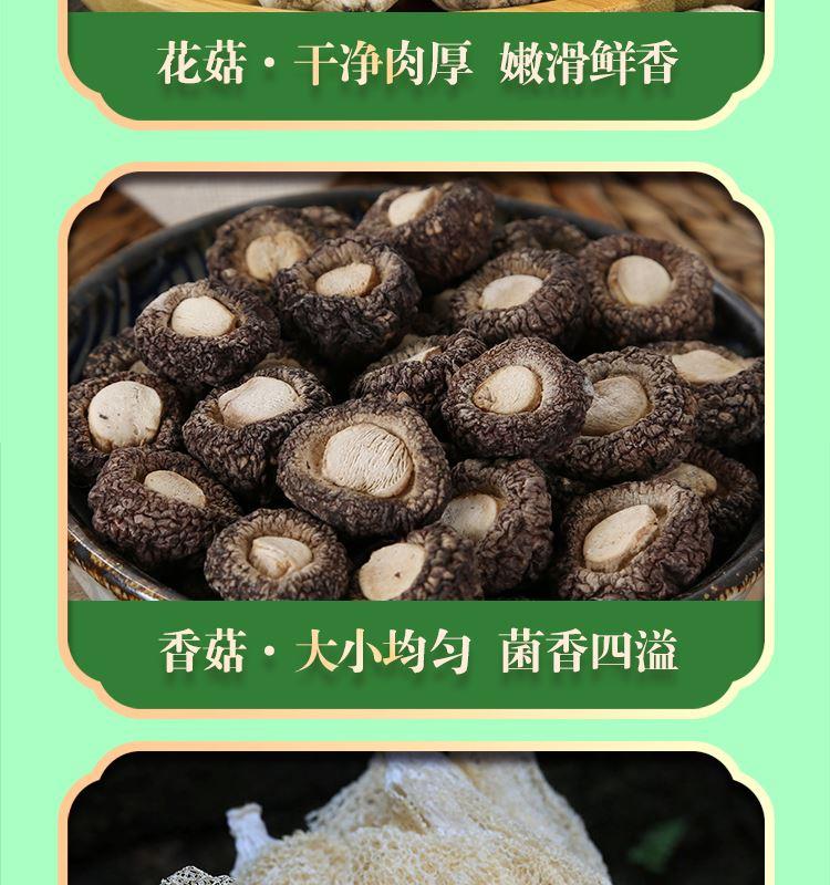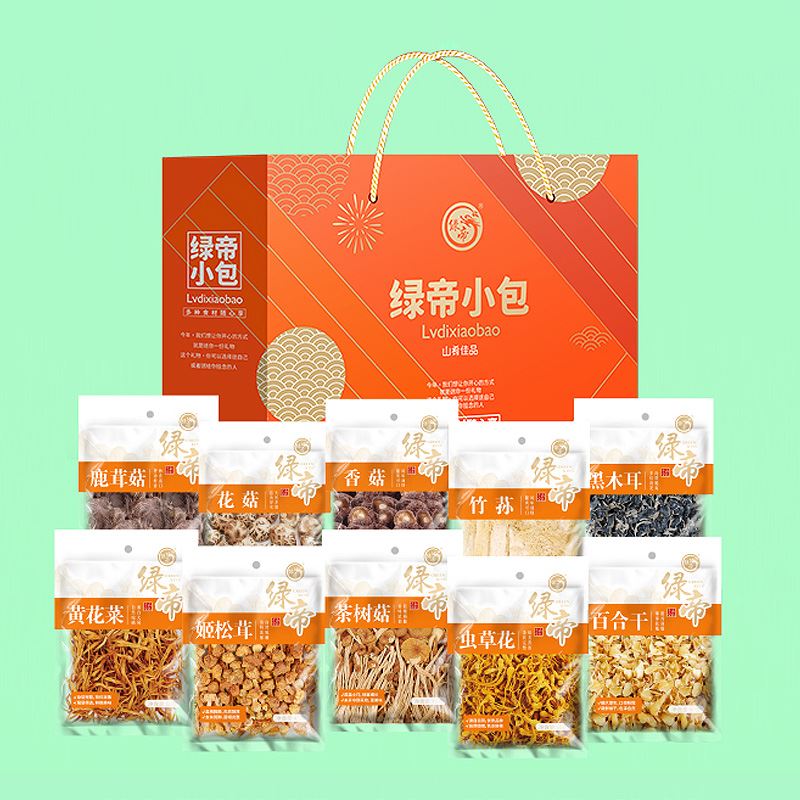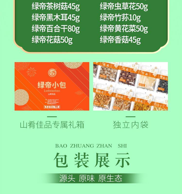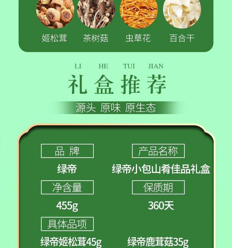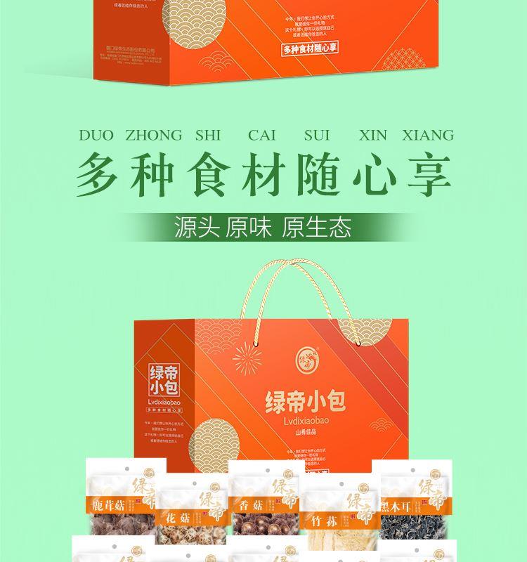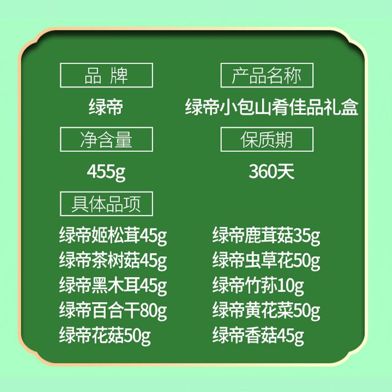 礼盒内含产品明细: 姬松茸45g、花菇50g、鹿茸菇35g、茶树菇45g、虫草花50g、黑木耳45g、香菇45g、竹荪10g、百合干80g、黄花菜50g 规格型号:455g/盒 产地:福建厦门 保质期:365天