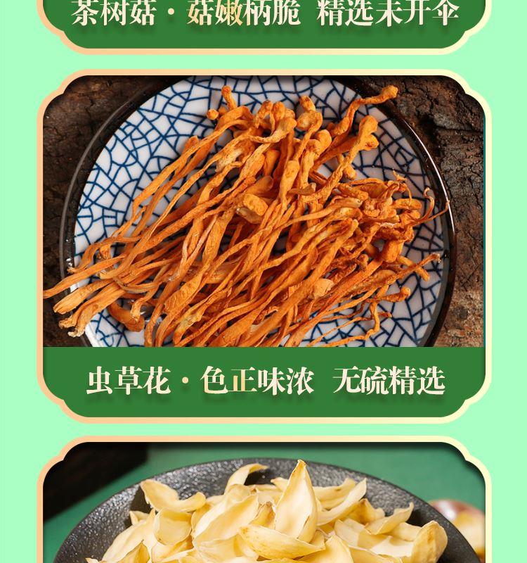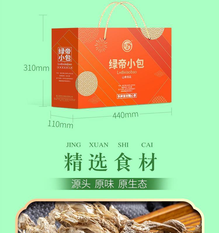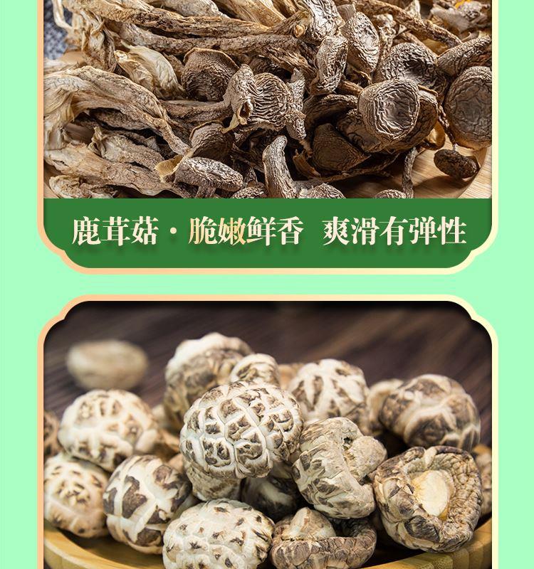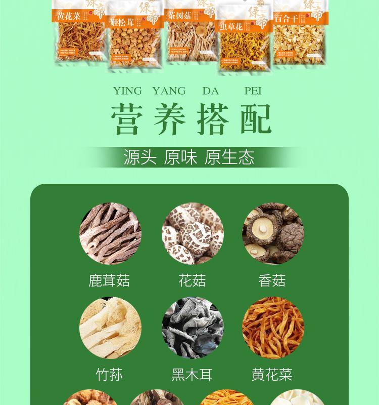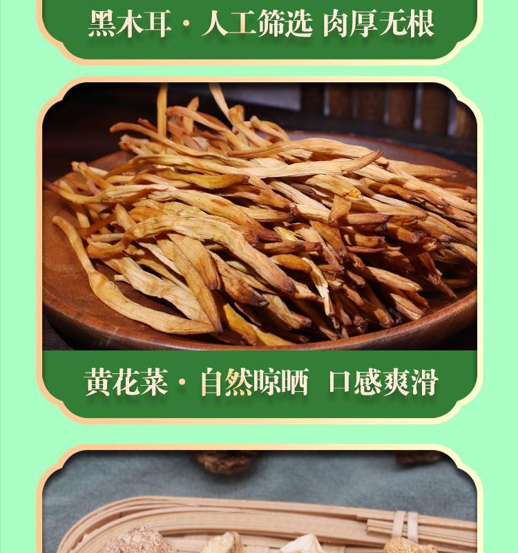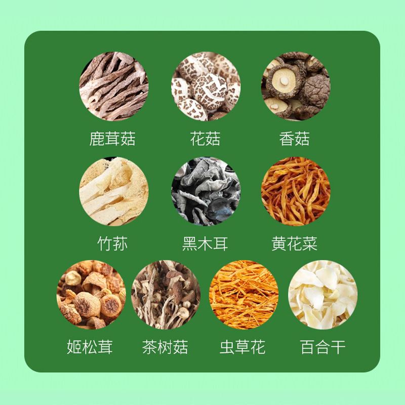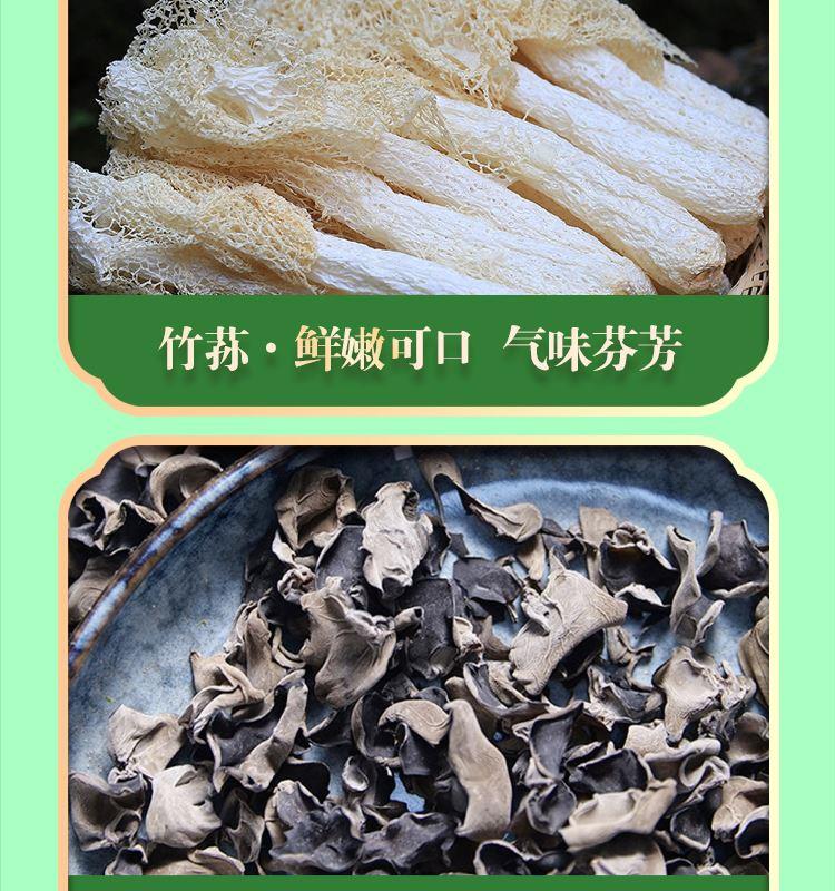 礼盒内含产品明细: 姬松茸45g、花菇50g、鹿茸菇35g、茶树菇45g、虫草花50g、黑木耳45g、香菇45g、竹荪10g、百合干80g、黄花菜50g 规格型号:455g/盒 产地:福建厦门 保质期:365天