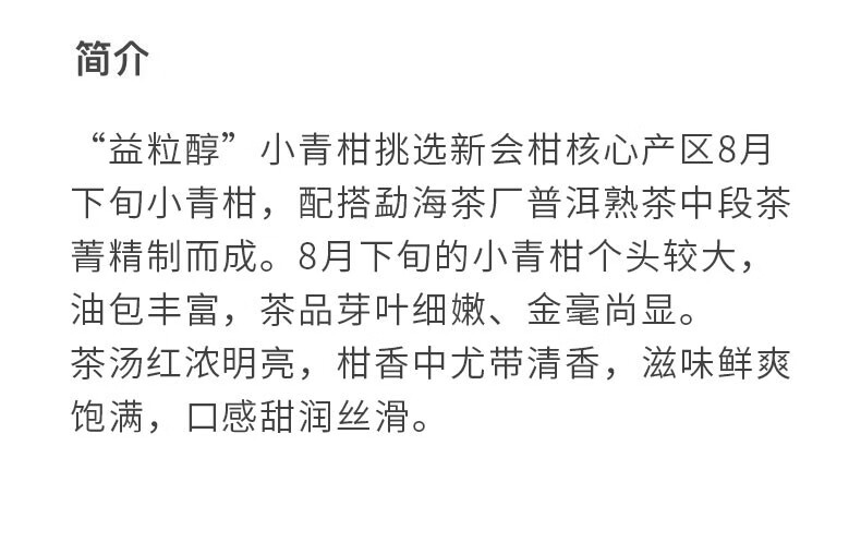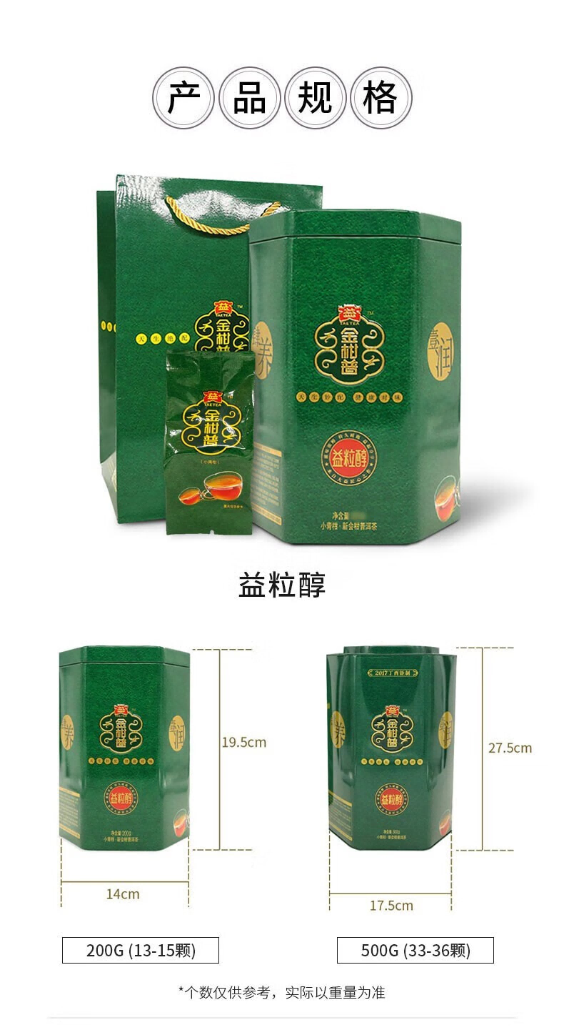 品牌: 大益 商品名称:大益小青柑 普洱茶 金柑普茶 陈皮新会 益粒醇小青柑500g(送礼袋) 商品编号:28928450571 店铺: 大益普洱茶专卖店 类型:小青柑 建议茶具:飘逸杯,盖碗 包装形式:罐装 储存方法:避光;密封;防潮;干燥;通风 保质期:长期保存 总净含量:500g