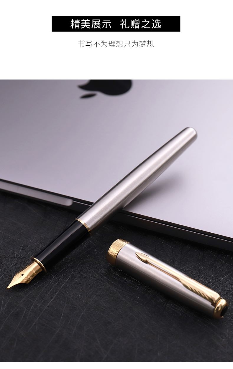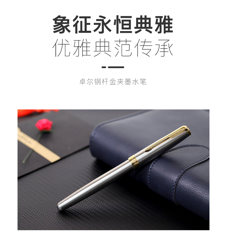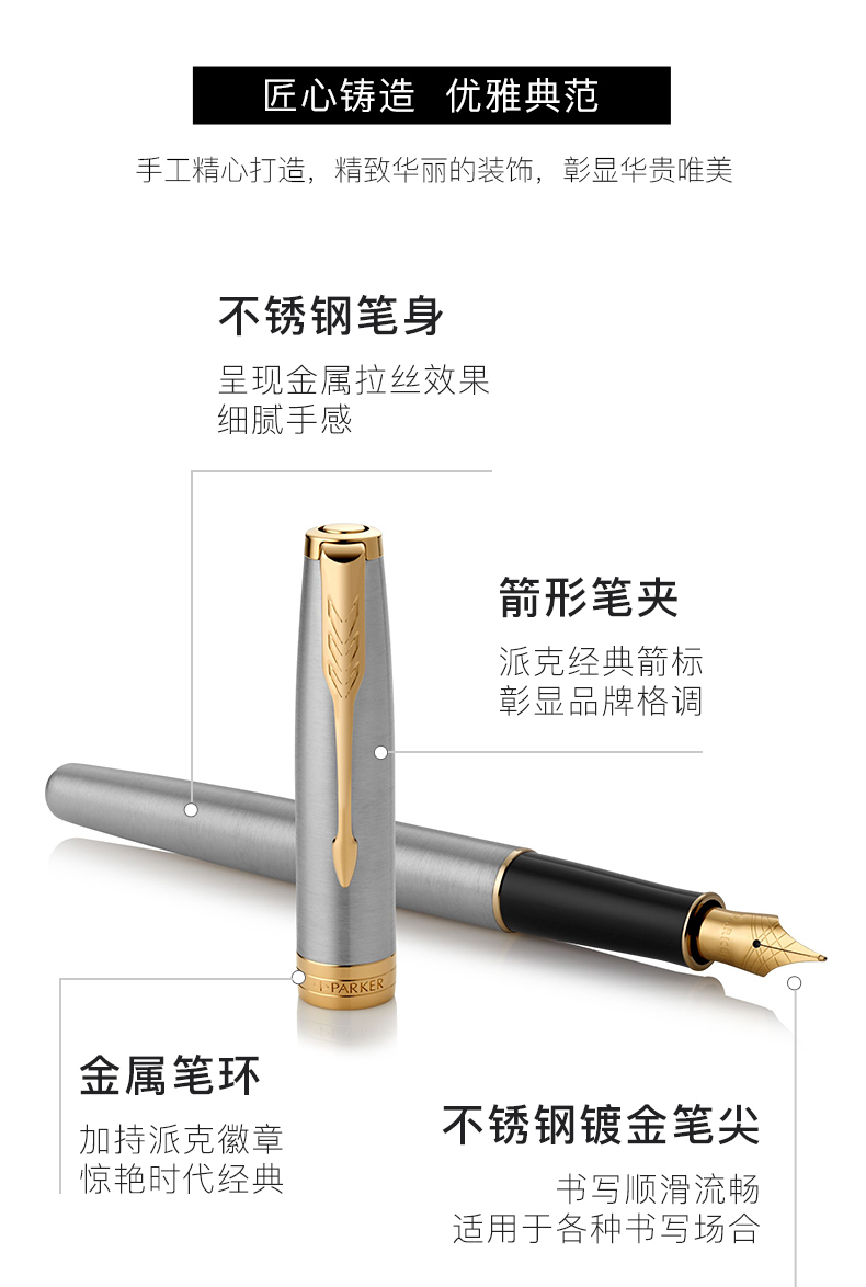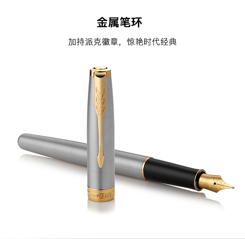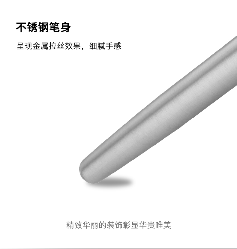 笔尖:不锈钢镀金 笔身:拉丝不锈钢 笔饰:镀金 笔帽:拉丝不锈钢 配置:笔*1、包装*1、手提袋*1