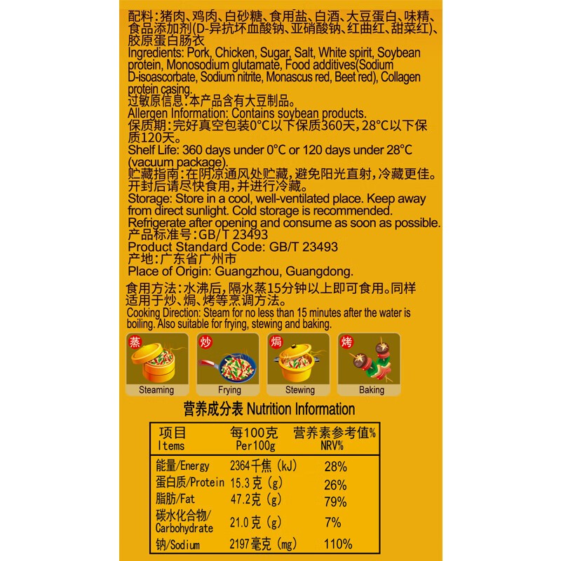 产地;广东 特产品类;广式腊肠 包装形式;袋装 食用方法;烹饪食用 加工工艺;烘干 保质期;120天 总净含量;250g
