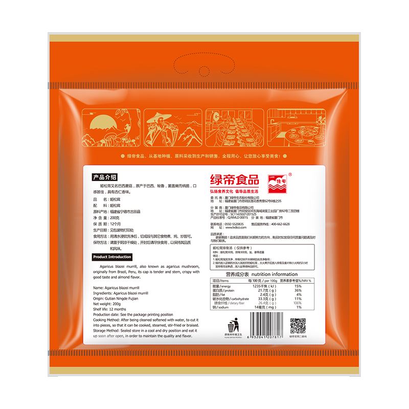 商品名称:绿帝姬松茸 重量:200g/袋 产地:福建宁德 保质期:365天