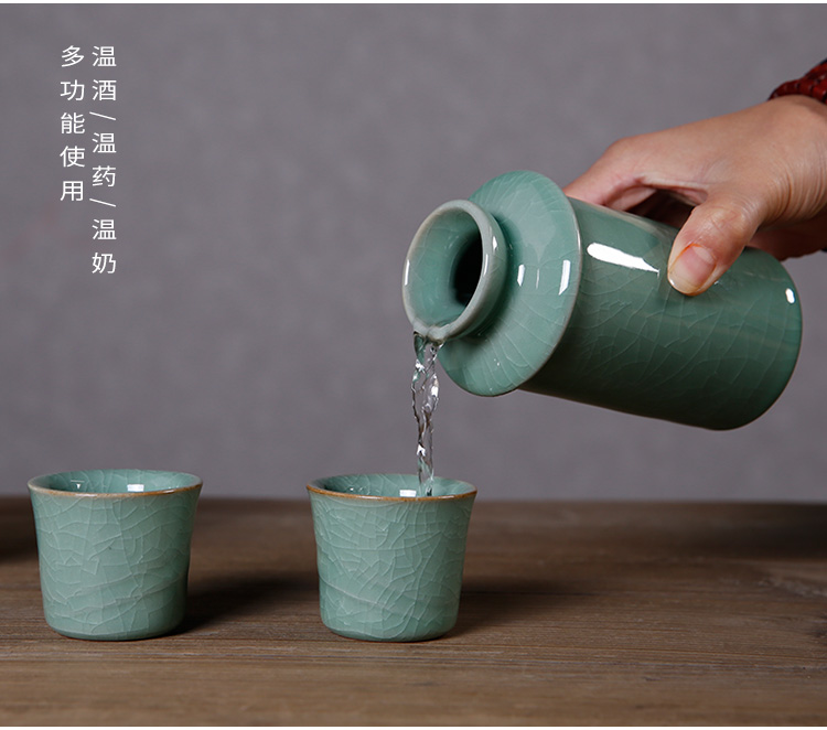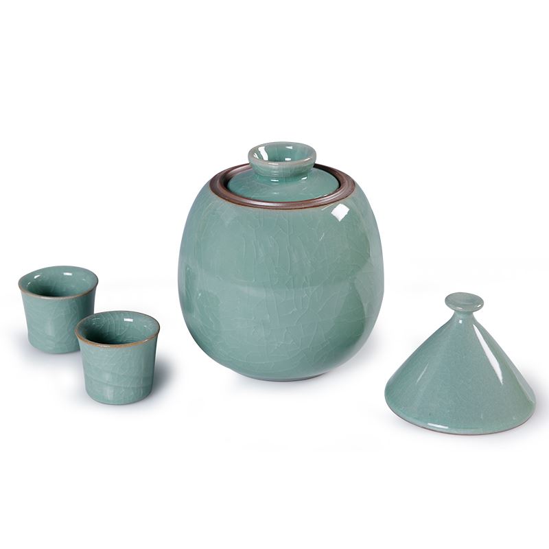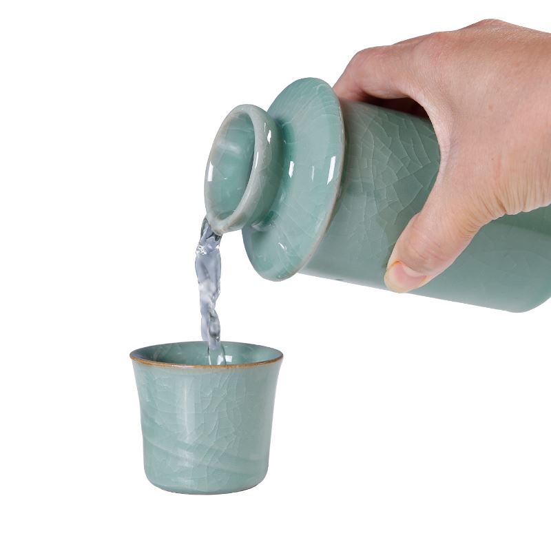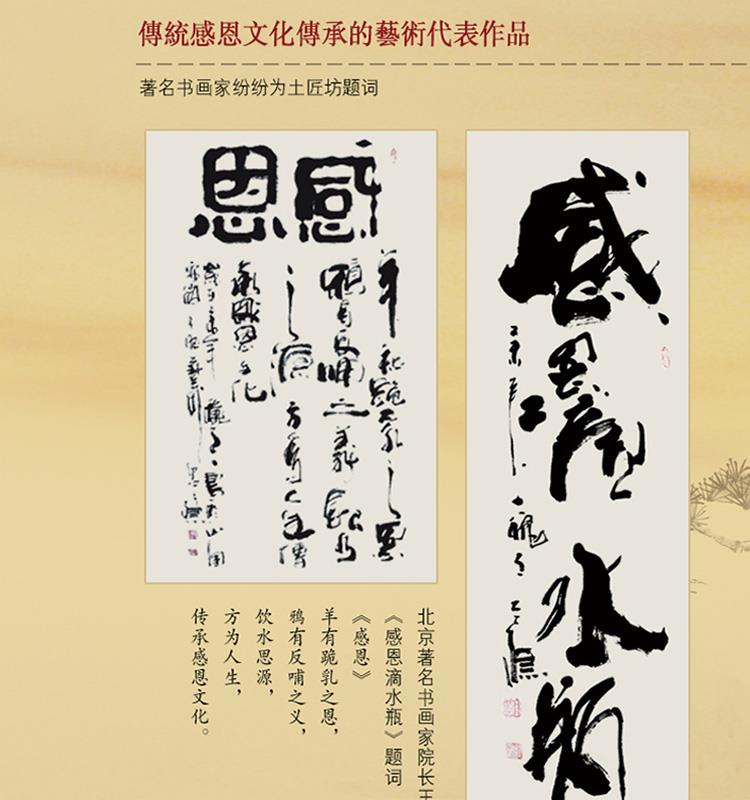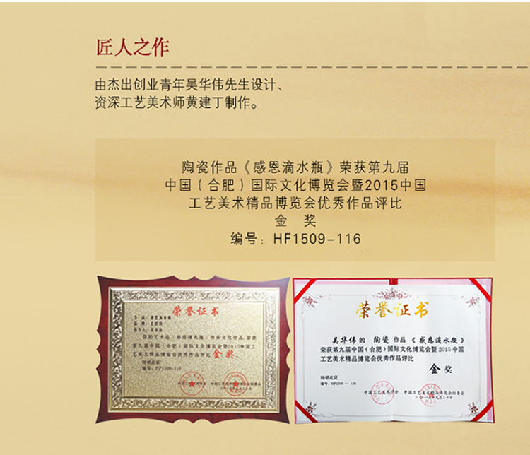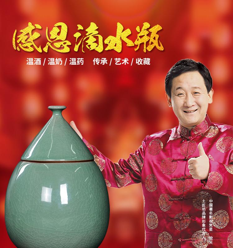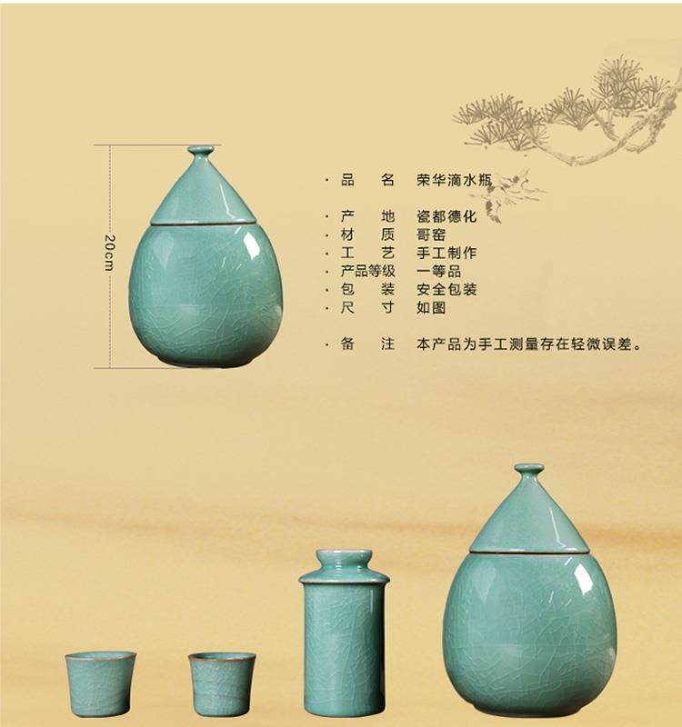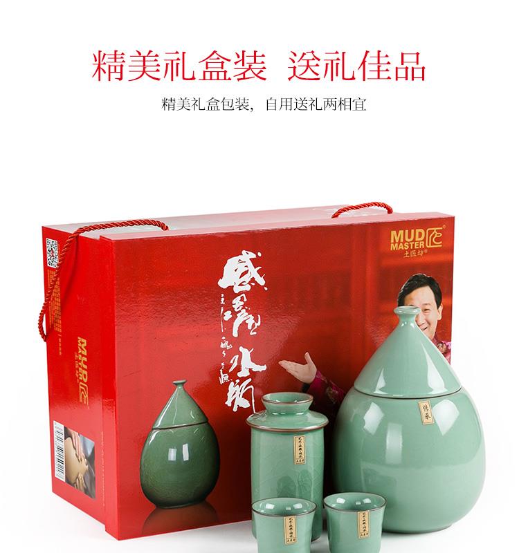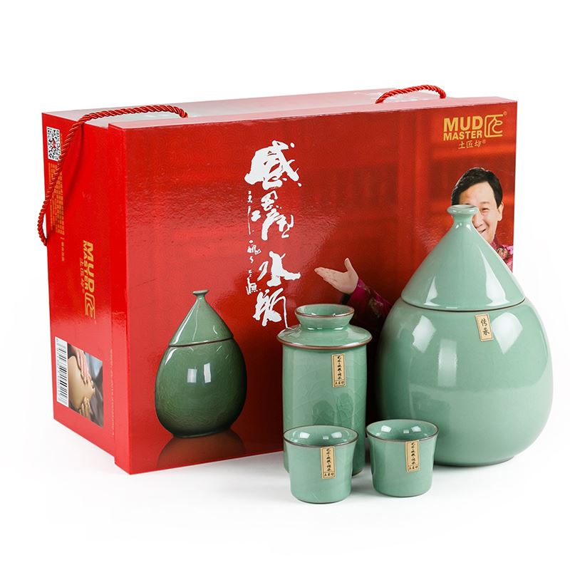 产品名称:土匠坊感恩滴水瓶 产品型号:JX-T-0088 产品容量:260ML(内胆)40ML(杯子) 礼盒规格:35*27*17.5cm 产品净重:1.4kg 装箱数量:6套/箱 主体材质:哥窑 产品描述 1.哥窑材质,能使大分子变小分子,具有很好的乳化力、溶解力和渗透力,有利于人体吸收。 2.用滴水瓶温酒,温奶,温药,能变软、变甜。 3.大师设计,高价值推广,收藏鉴赏,实用性强。