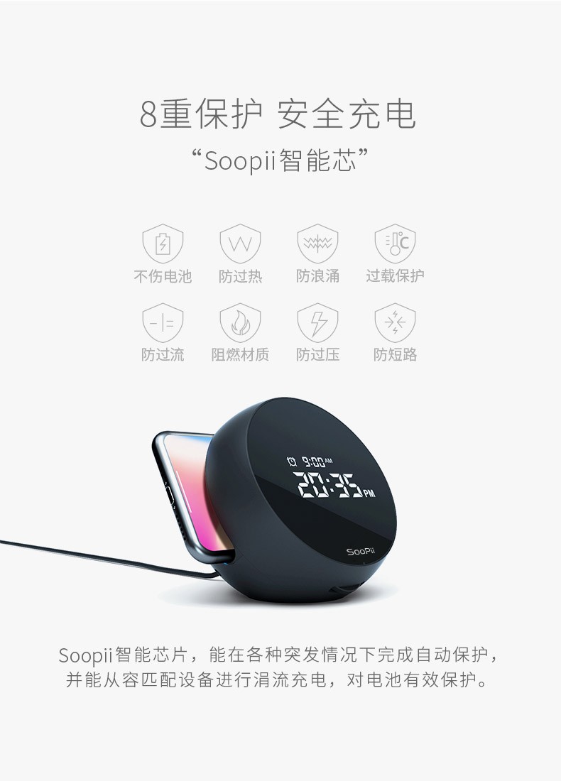 材料:防火材料 总输出功率:10WMax 充电器输入:100-240V50/60Hz 无线充输出:5V2.1A