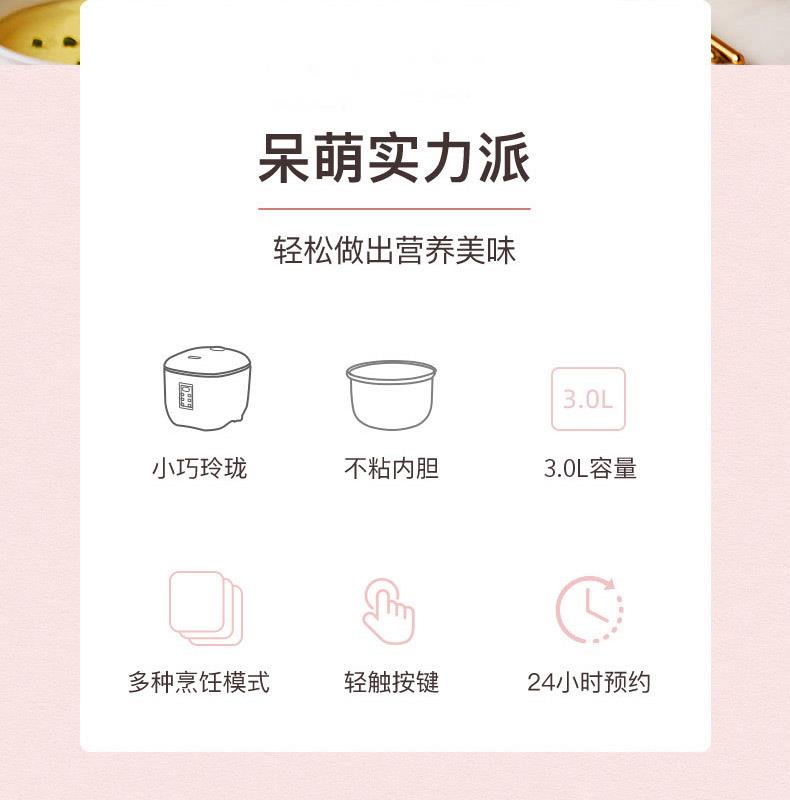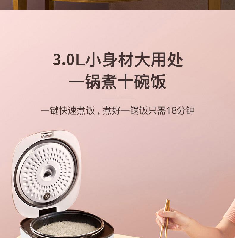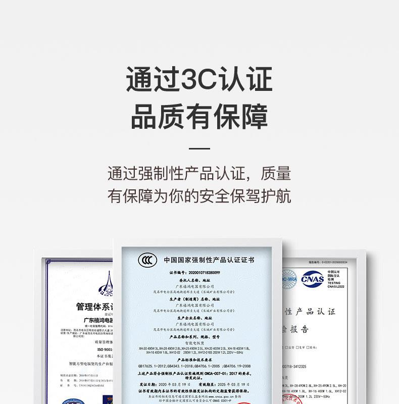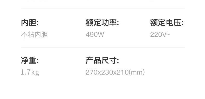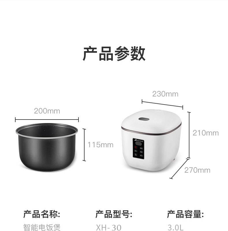 产品型号:XH-30 产品颜色:白色 产品容量:3L 额定功率:490W 额定电压:220V~ 产品毛重:2.25KG 产品尺寸:250*200*195MM 包装尺寸:305*267*252MM 装箱数量:单台为彩盒或网购盒包装箱;8台/箱
