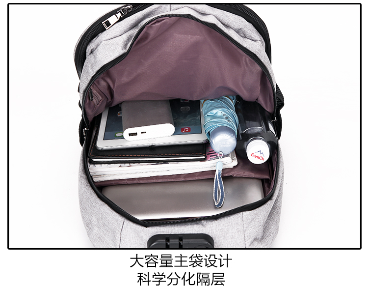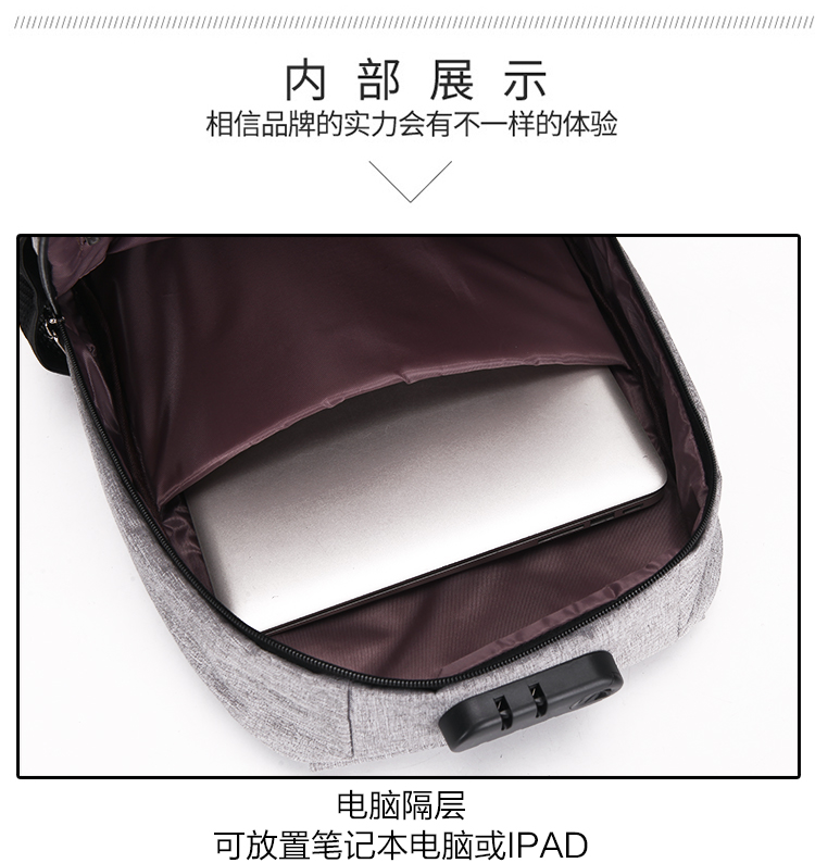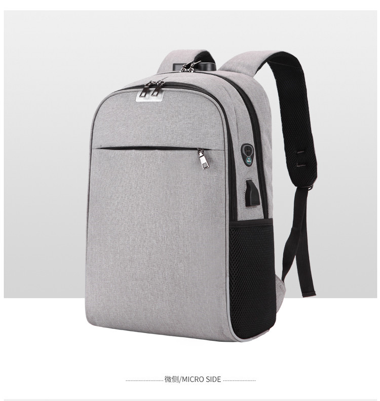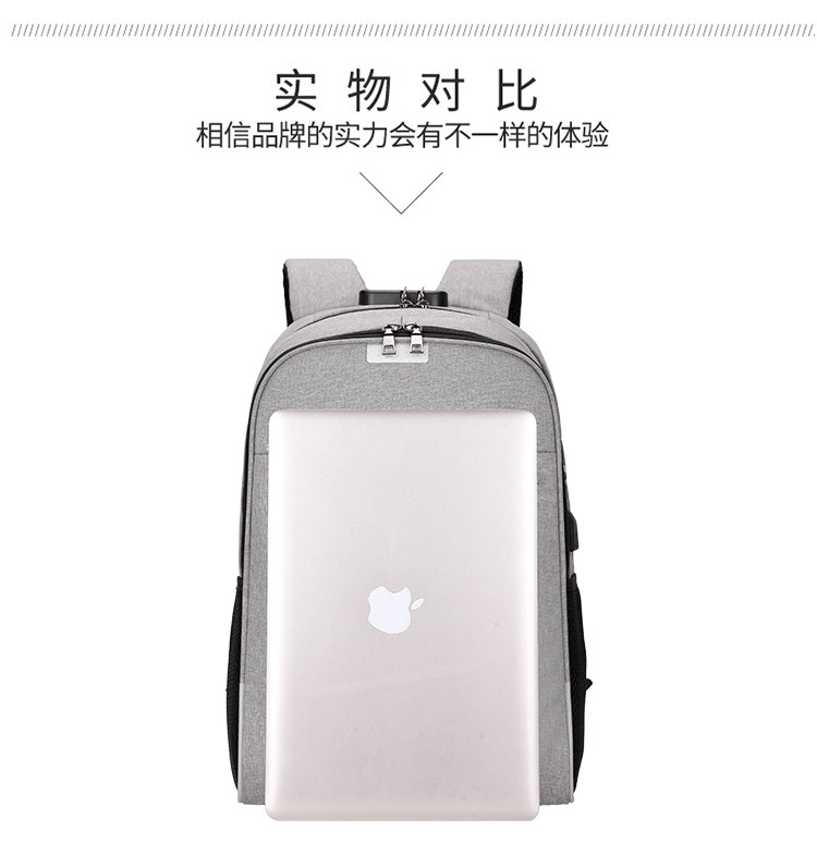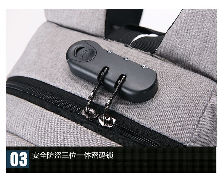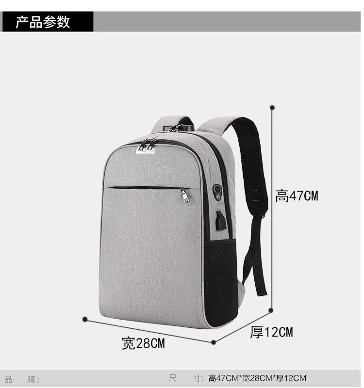产品参数: 型号:背包3107 颜色:黑色、灰色、蓝色 尺寸:47*28*12cm 材质:尼龙布 重量:0.56kg 商品简介: 一款带有密码锁的背包,让出行变的更安全。