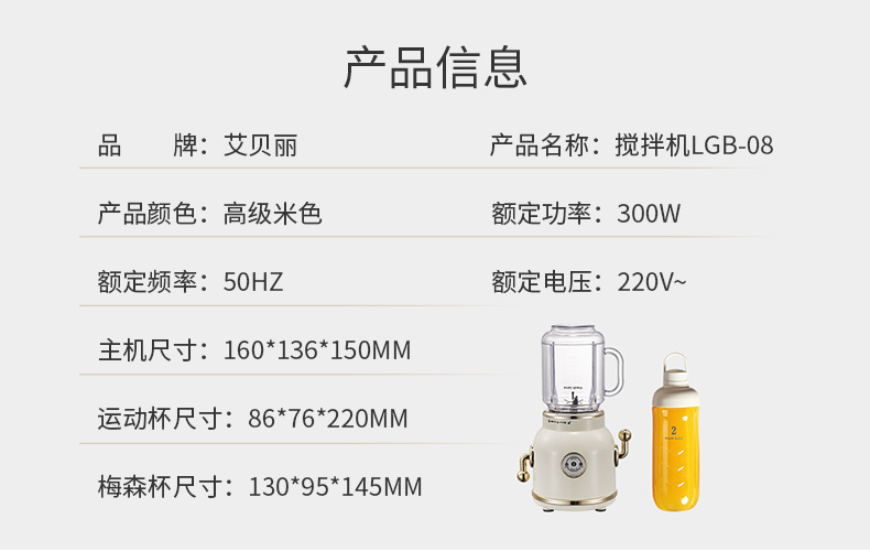 产品型号:LGB-08 产品颜色:米色 额定容量:300ML 额定功率:300W 额定电压:220V~ 产品毛重:1.65KG 主机+梅森杯尺寸:185*140*315MM 主机+随身杯:185*140*285MM 包装尺寸:285*165*320MM 装箱数量:单台为彩盒包装箱;8台/箱