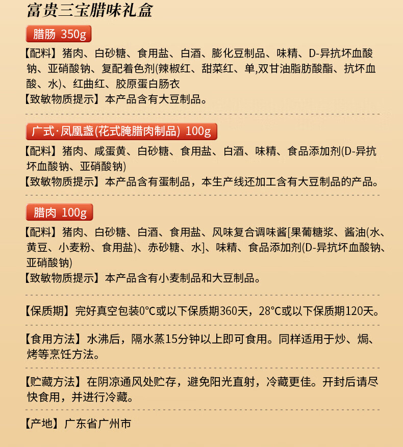 特产品类;广式腊味 包装形式;袋装 食用方法;烹饪食用 加工工艺;不烟熏 保质期;120天