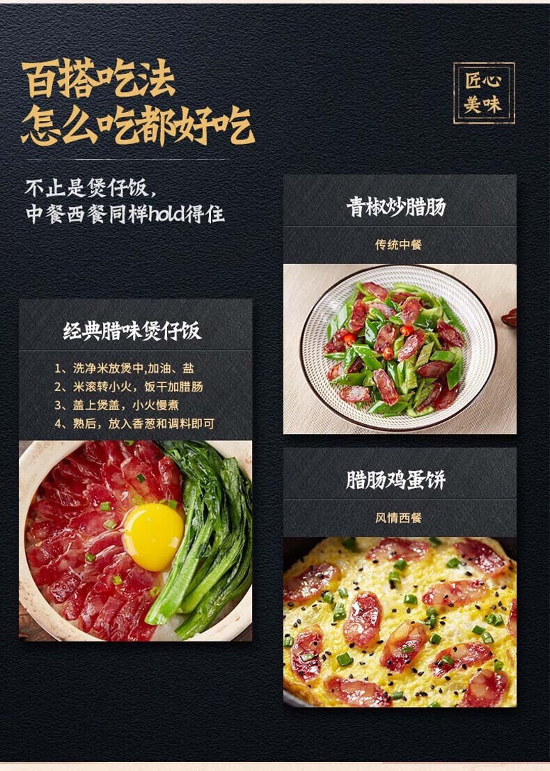 产地:广东 特产品类:广式腊肠 包装形式:袋装 食用方法:烹饪食用 加工工艺:烘干