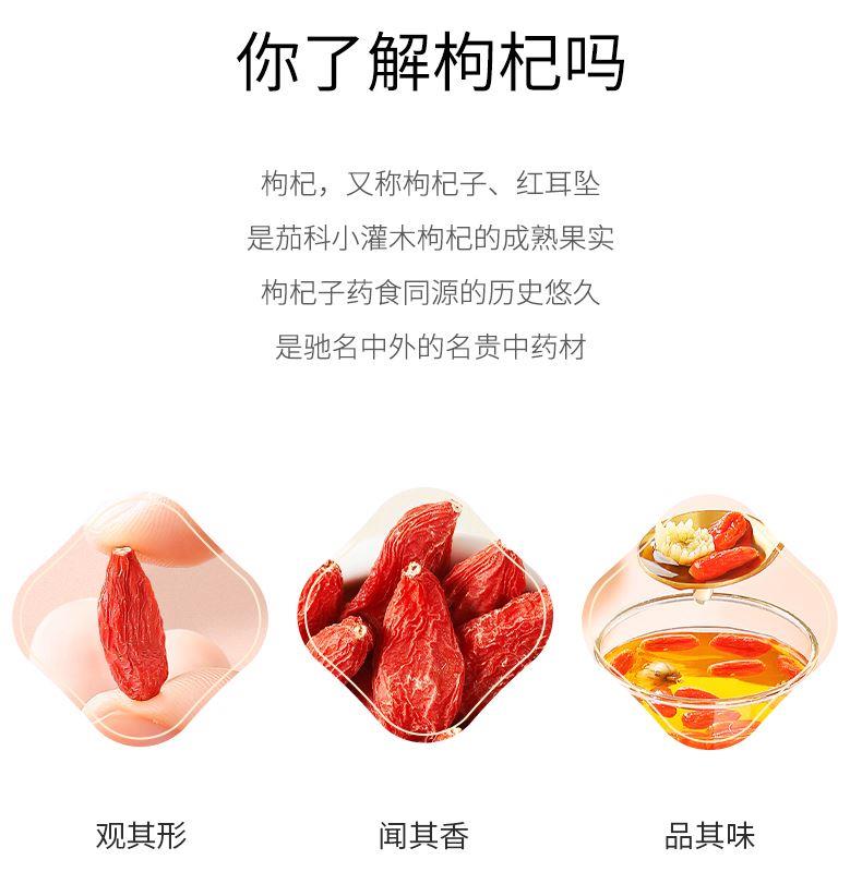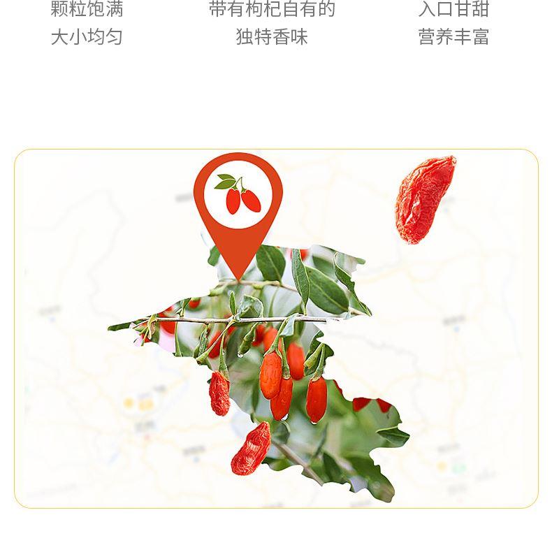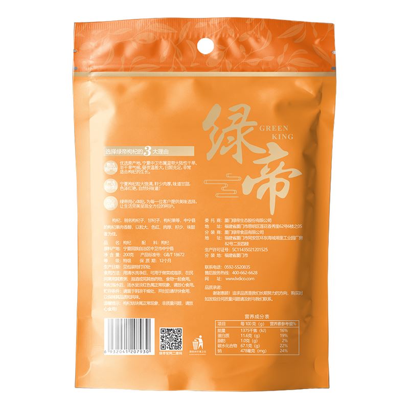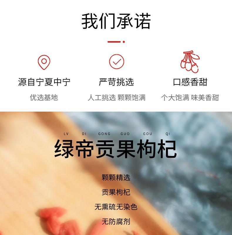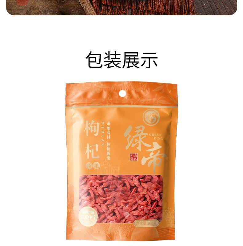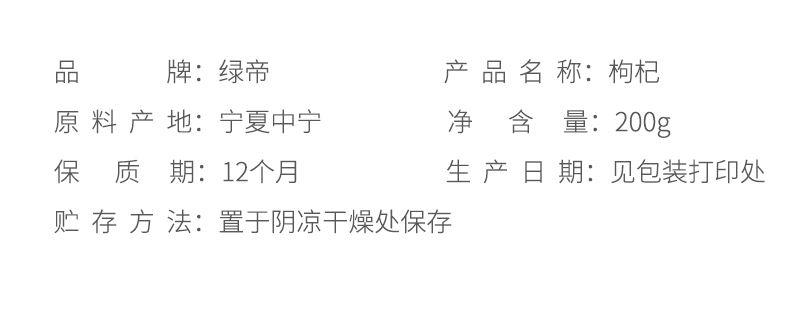 商品名称:绿帝贡果枸杞 重量:200g/袋 产地:宁夏中卫 保质期:365天
