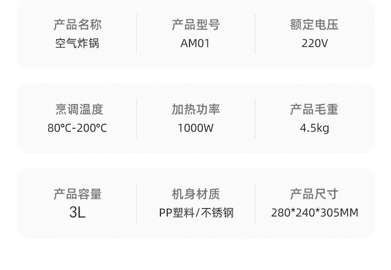 产品型号: AM01 产品颜色:墨绿色 产品容量:3L 额定功率:1000W 额定电压:220V~ 产品毛重:4.05KG 产品尺寸:280*240*300MM 彩盒尺寸:306*307*345MM 装箱数量:单台为彩盒或网购盒包装箱;4台/箱