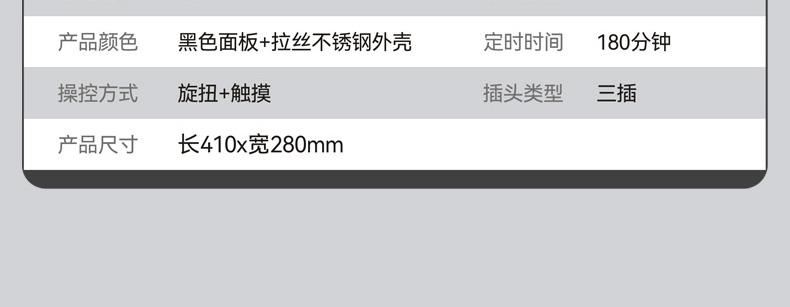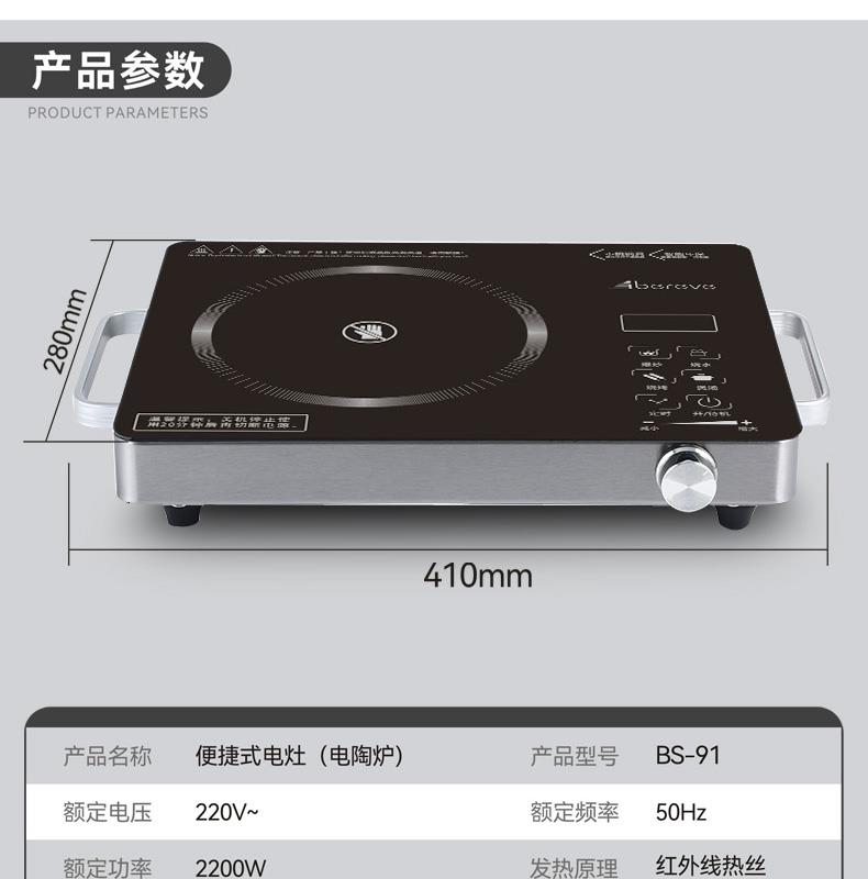 产品型号:BS-91 产品颜色:黑色 发热原理:电阻丝发热 额定功率:2000W 额定电压:220V~ 产品毛重:2.67KG 产品尺寸:410*280*65MM 包装尺寸:445*100*335MM 装箱数量:单台为网购盒包装箱;6台/箱
