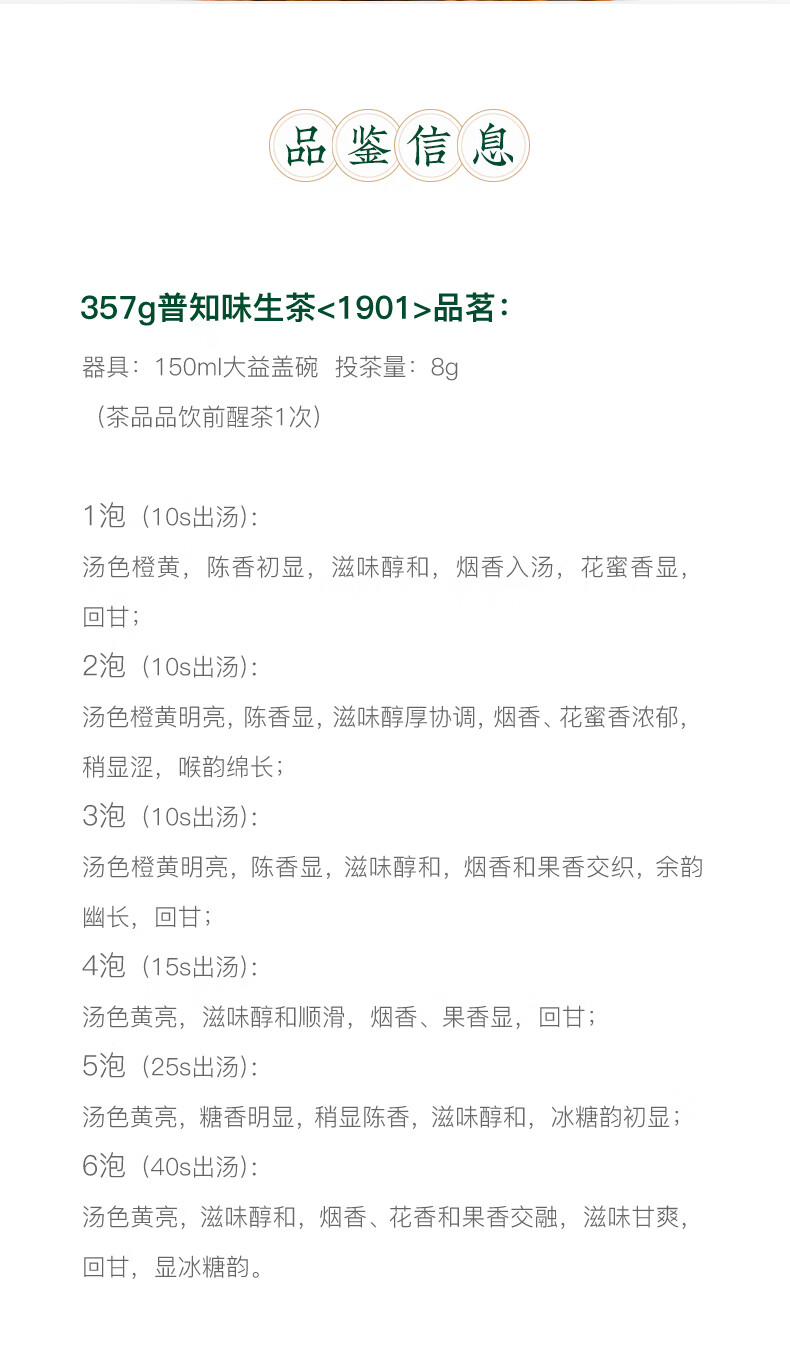 品牌: 大益 商品名称:大益普洱茶饼茶 3年陈料普知味生茶357g/饼 商品编号:100040238343 货号:DL000074 建议茶具:盖碗 茶区:西双版纳茶区 类型:紧压茶 包装形式:礼盒装 发酵程度:不发酵 总净含量:357g 保质期:长期保存 加工工艺:杀青;晒青;萎凋;揉捻 储存方法:避光;密封;防异味;干燥;防潮 生产许可证号:SC11453282228141 产品标准号:GB/T22111-2008