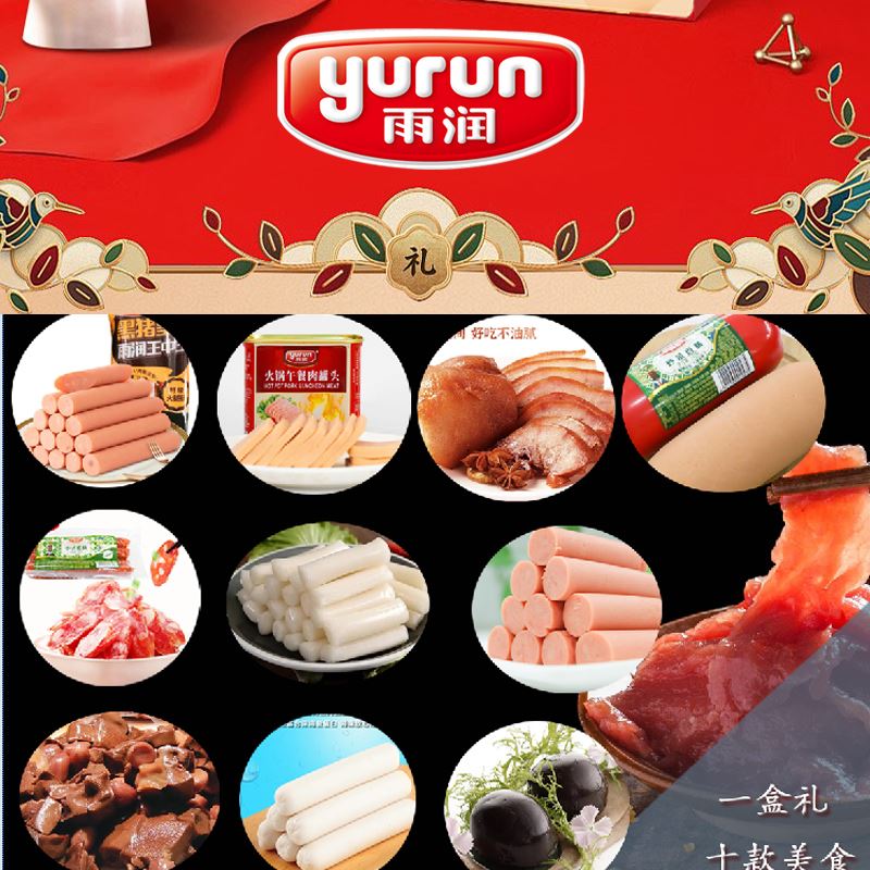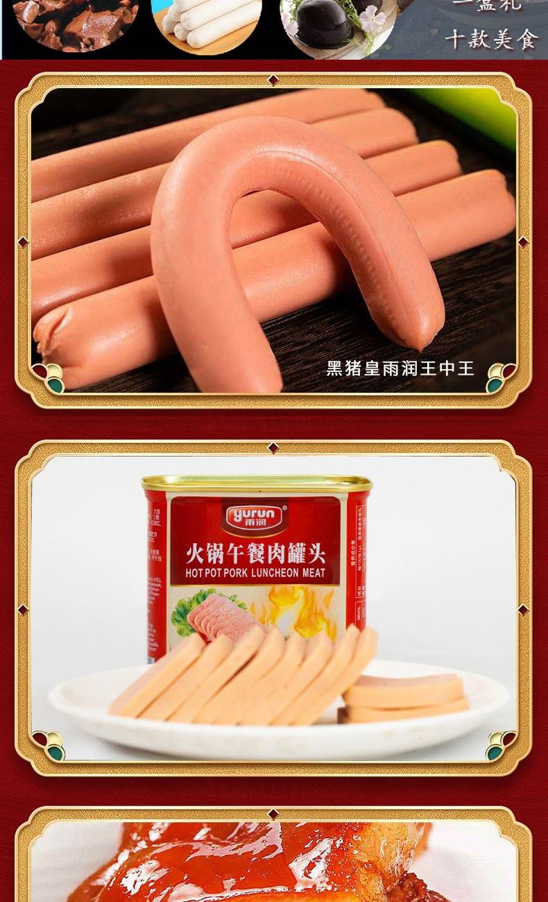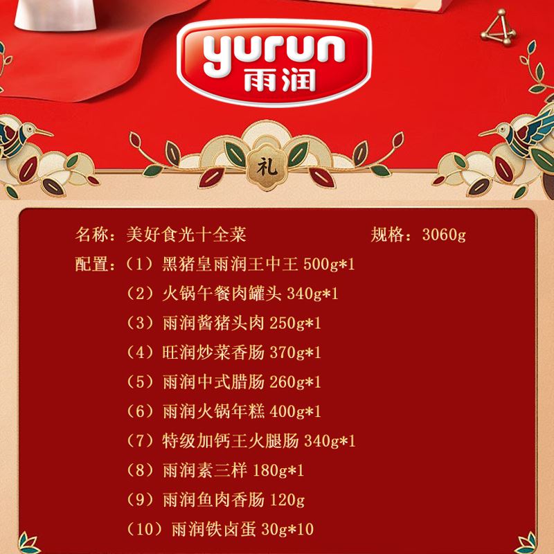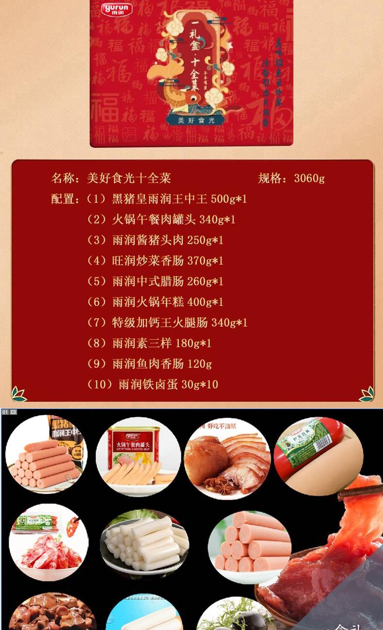 雨润美好食光3060g十全菜熟食礼盒 (1)黑猪皇雨润王中王500g*1 (2)火锅午餐肉罐头340g*1 (3)雨润酱猪头肉250g*1 (4)旺润炒菜香肠370g*1 (5)雨润中式腊肠260g*1 (6)雨润火锅年糕400g*1 (7)特级加钙王火腿肠340g*1 (8)雨润素三样180g*1 (9)雨润鱼肉香肠120g (10)雨润铁卤蛋30g*10