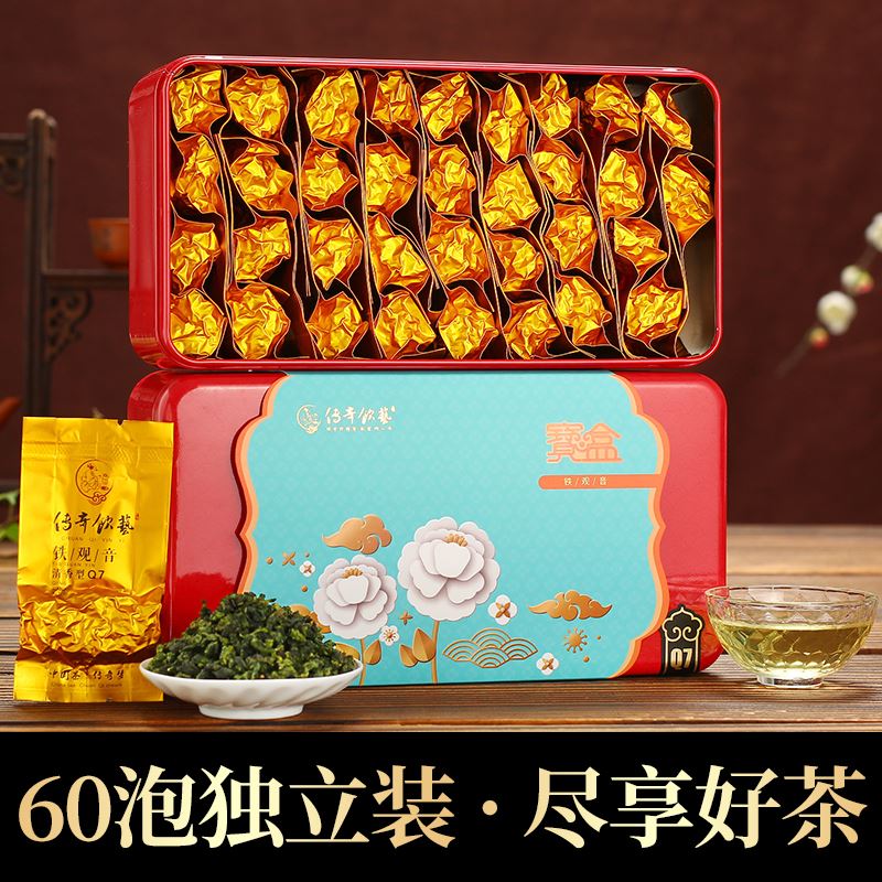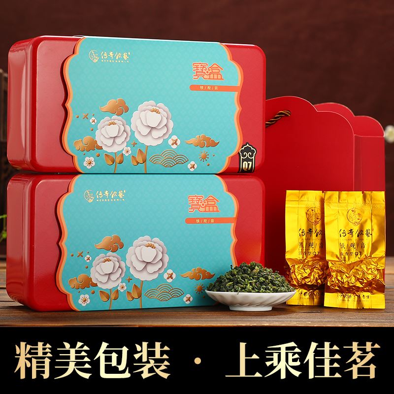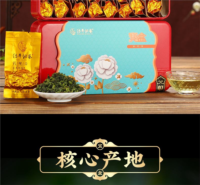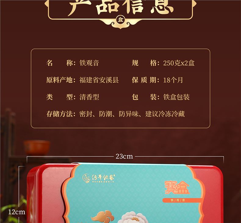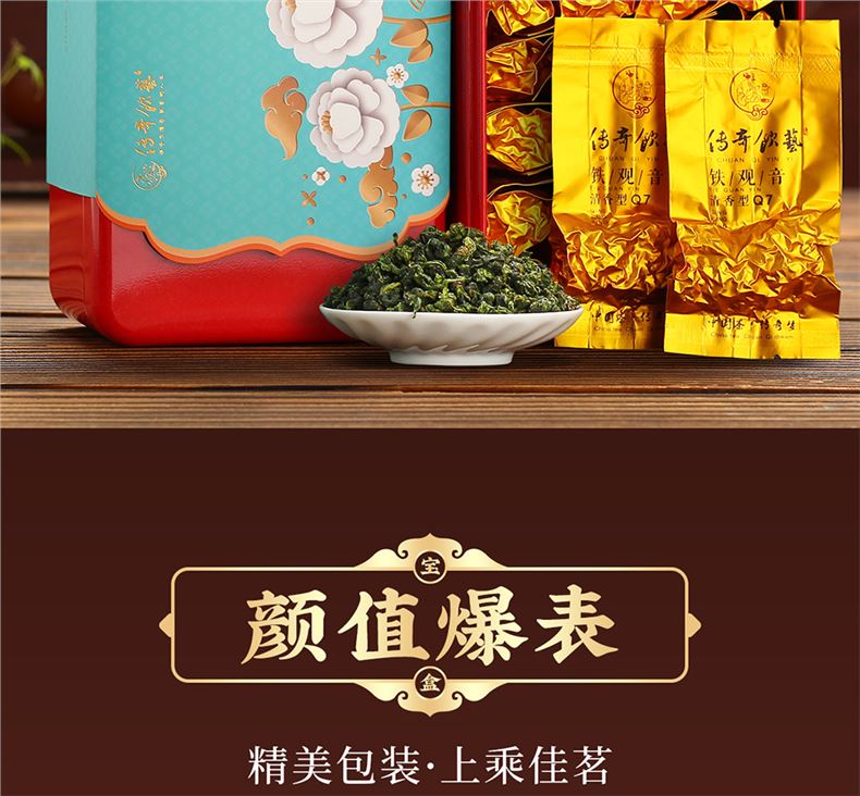 商品名称:宝盒系列清香型铁观音Q7 规格:500克(250克/盒*2盒配一提手提袋) 尺寸:28.5*24.5*11cm 清香型铁观音Q7(250克/盒*2盒共60泡,配一提手提袋)精美包装,上乘佳茗,送礼自饮两相宜,观音韵兰花香明显,七泡有余,耐泡十足