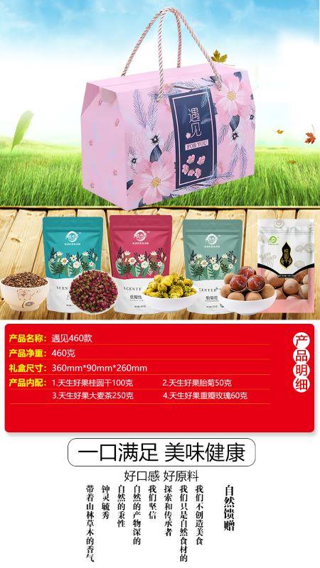 尺寸:320*120*230mm 规格:460克(4袋装) 1.天生好果胎菊花50克 2.天生好果大麦茶250克 3.天生好果重瓣红玫瑰60克 4.天生好果新疆红枣100克